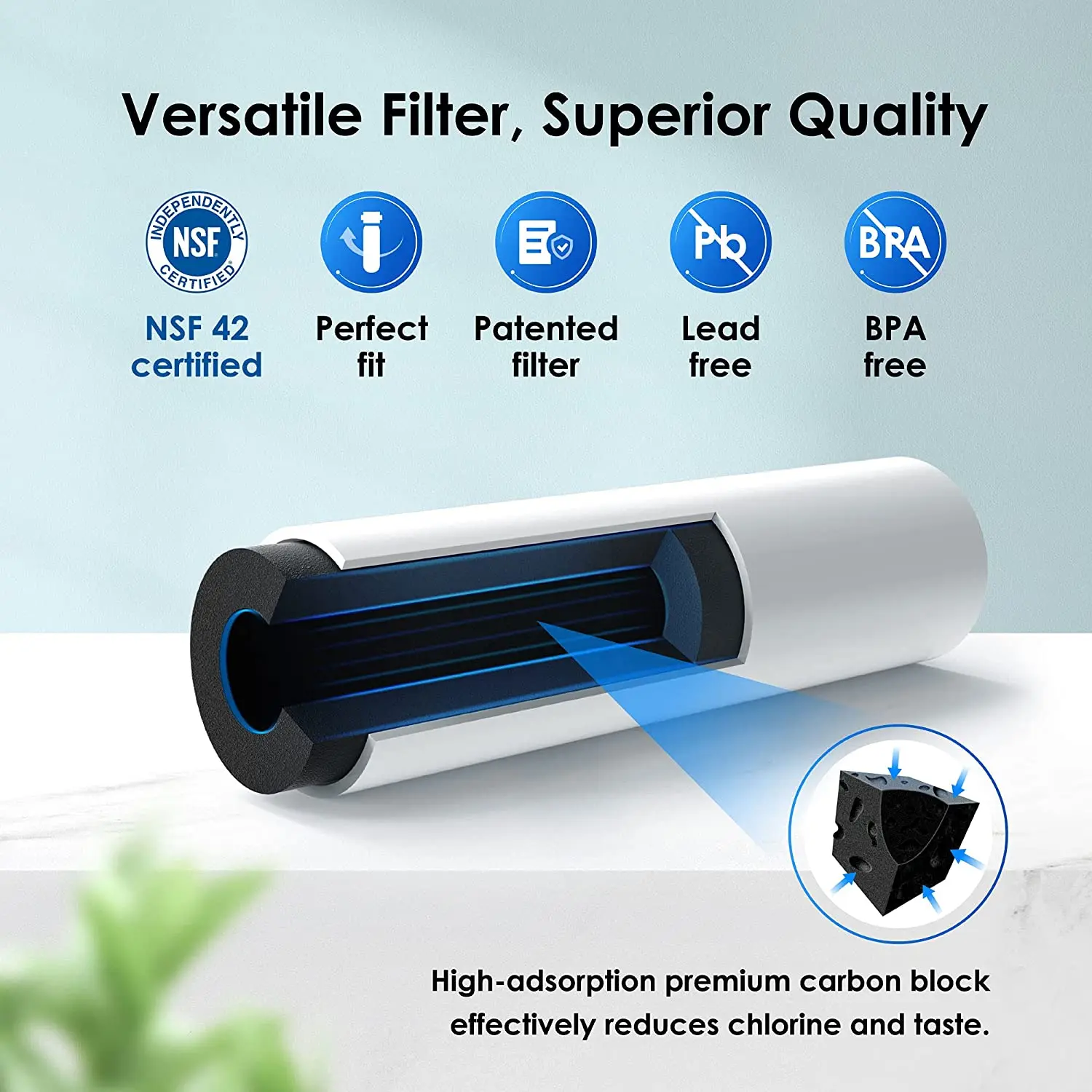 Не содержит бисфенол и пищевые материалы. Этот фильтр изготовлен из передового природного карбонового скорлупы кокосового ореха и сертифицирован известными компаниями для безопасного материала. Внешний слой составляет 0,5 микрон, что обеспечивает лучшую фильтрацию. Углеродные блоки были независимо испытаны третьей стороной лаборатории для удаления тяжелых металлов, больших отложений и всех других опасных примесей и загрязняющих веществ.