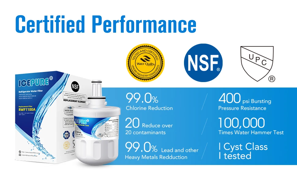 ICEPURERWF1100A Замена для Samsung DA29-00003G фильтр для воды холодильника имеет официальные сертификаты на рынках, такие как NSF/ANSI 42 и 372 без свинца от NSF и IAPMO, европейские правила качества пищевых продуктов EC-1935/2016, ROHS, REACH, BPA-Free, TUV и австралийский водяной знак.