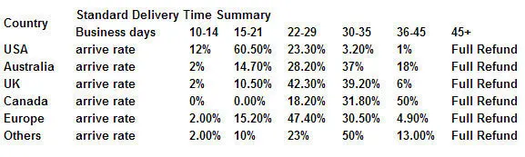Ниже приводится стандартная сводная информация о времени доставки, для поступления в Канаду требуется больше времени, обычно на 30 дней больше.