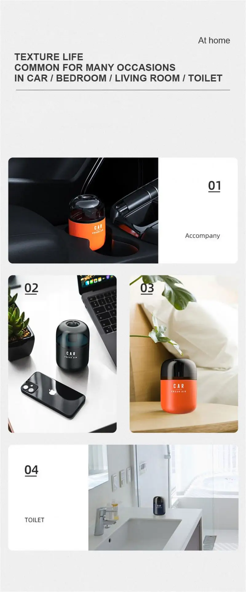 New air and new experience, quiet and fragrance, can be used at home and office in the car. Zero alcohol, purification of peculiar smell, small volume and large capacity, imported spices. Disperse the fragrance in three seconds, actively purify the peculiar smell in the car, enjoy the fresh air, and breathe freely. The fragrance capacity is as high as 148g, and the fragrance is more durable. There are a variety of fragrances, colors, and a variety of choices. There is always one that suits you.
