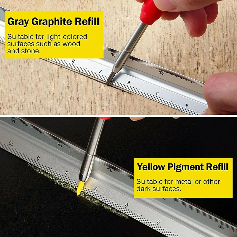 Маркер для деревообработки предварительно заполнен серым свинцом, поставляется с коробкой для пополнения, включающей 3