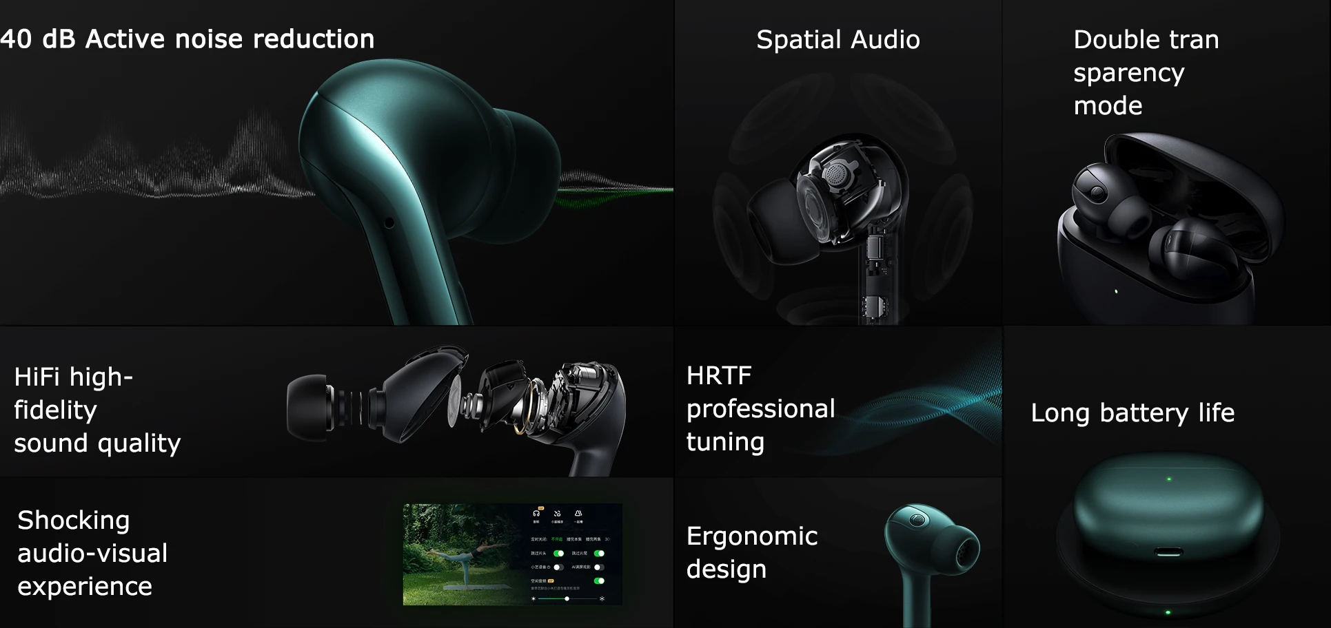 40 ДБ активное шумоподавлениеПространственное аудиоДвойной ТранМалозаметностьРежимHiFi high-ВерностьКачество звукаHRTF ПрофессиональныйНастройкаДлительный срок службы батареиШокирующийАудио-визуальныйОпыт работыЭргономичныйДизайн