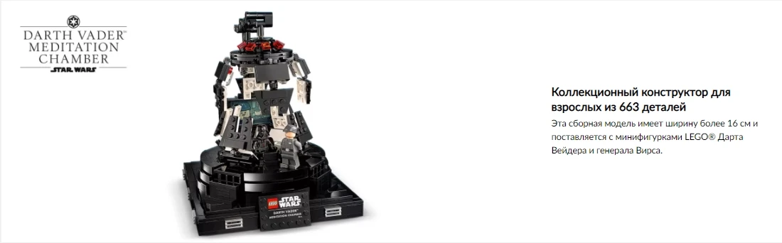 ОПИСАНИЕ Конструктор Lego Star Wars Камера для медитаций Дарта Вейдера 75296 - это новинка 2021 года. Даже Дарту Вейдеру бывает нужно побыть наедине с собой. Сделайте перерыв и соберите первую в истории LEGO модель камеры для медитаций Темного Владыки. Воссоздайте знакомые детали камеры из фильма «Звездные войны: Империя наносит ответный удар», в том числе функцию открывания и закрывания, вращающееся кресло Дарта Вейдера и место, где может встать генерал Вирс. Дополняет впечатляющее украшение табличка с названием. В набор с этой моделью для демонстрации входят две минифигурки LEGO Star Wars: Дарт Вейдер и генерал Вирс с бластерным пистолетом. Камера открывается и закрывается, как настоящая, и в ней есть вращающееся кресло для Дарта Вейдера, большой экран, панели управления, место, на котором может стоять генерал Вирс, и табличка с названием. Собранная модель не занимает много места - она лишь немного превышает 18 см в высоту, 16 см в ширину и 19 см в глубину.