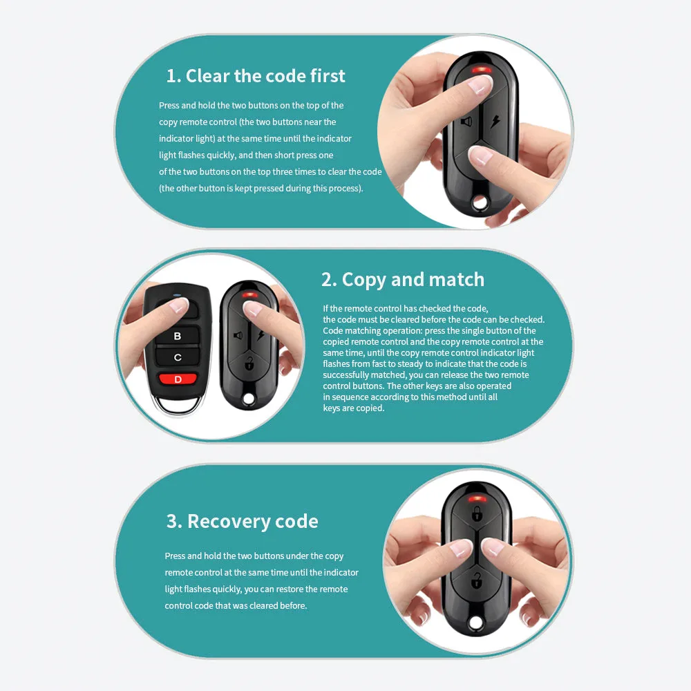 Нажмите одну кнопку скопированного пульта дистанционного управления и копируйте пульт дистанционного управления одновременно, до тех пор, пока индикатор пульта дистанционного управления не изменится с быстрого мигания на постоянный свет, чтобы показать, что копия выполнена успешно, вы можете отпустить две кнопки дистанционного управления. Остальные ключи также управляются в соответствии с этим методом до тех пор, пока все ключи не будут скопированы.