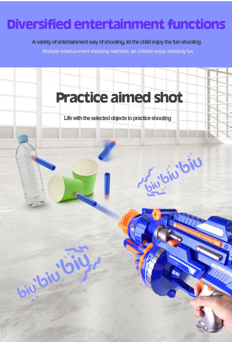 1. Игрушечный пистолет изготовлен из высококачественного АБС-пластика, анти-шок и долговечность. 2. Головка и оружие игрушечного пистолета снимаются и снимаются 3. Пластиковый игрушечный пистолет может воспроизводить звуки при работе. 4. Зажим игрушечного пистолета может вместить 6-20 пуль 5. Пластмассовая игрушка-пистолет требует 4-6 батареек АА, не включая. Примечание: Это не оружие nerf, но он имеет хороший опыт, такой же, как игрушечный пистолет «нефть», плотно нажимает кнопку питания и не отпускает. Когда вы нажимаете на спусковой крючок, Воспроизводите его назад, а затем нажмите его снова, не продолжайте слишком быстро. Название продукта: мягкая игрушечная пуля