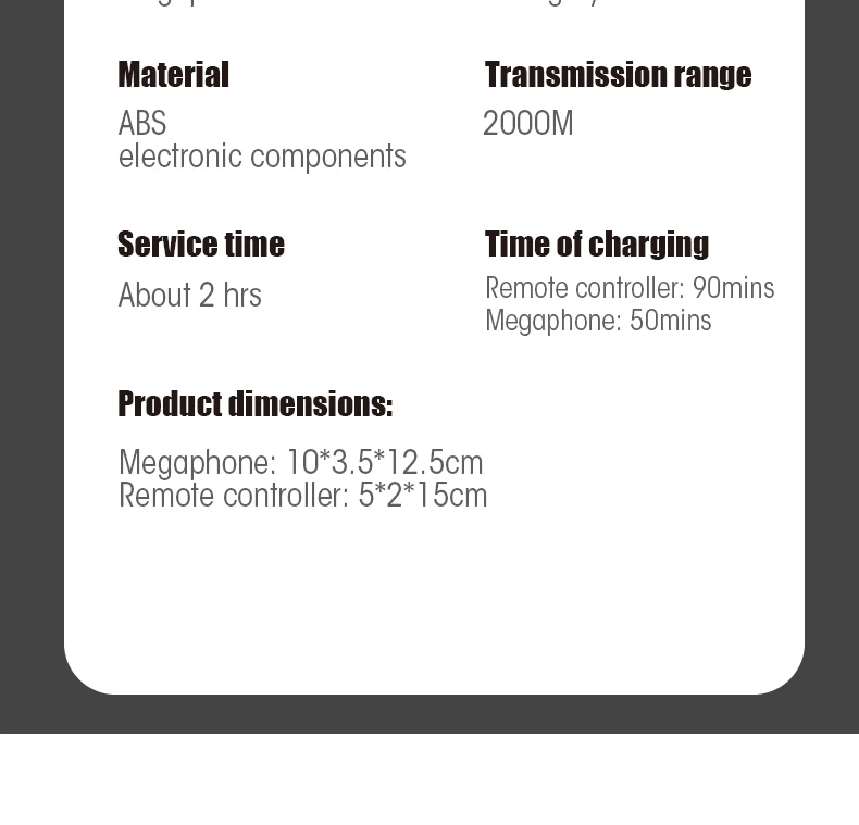 1. Громкоговоритель высокой мощности, до 115 дБ, полное использование различных сценариев, таких как проведение мероприятий, борьба с вирусом, эвакуация толпы, предупреждение об опасности и т. д.