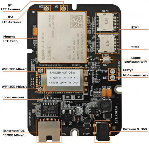 TANDEM-4GT-OEM - это встраиваемый LTE (Cat.6) модуль три в одном: 3G\4G модем, WiFi роутер и POE инжектор.
