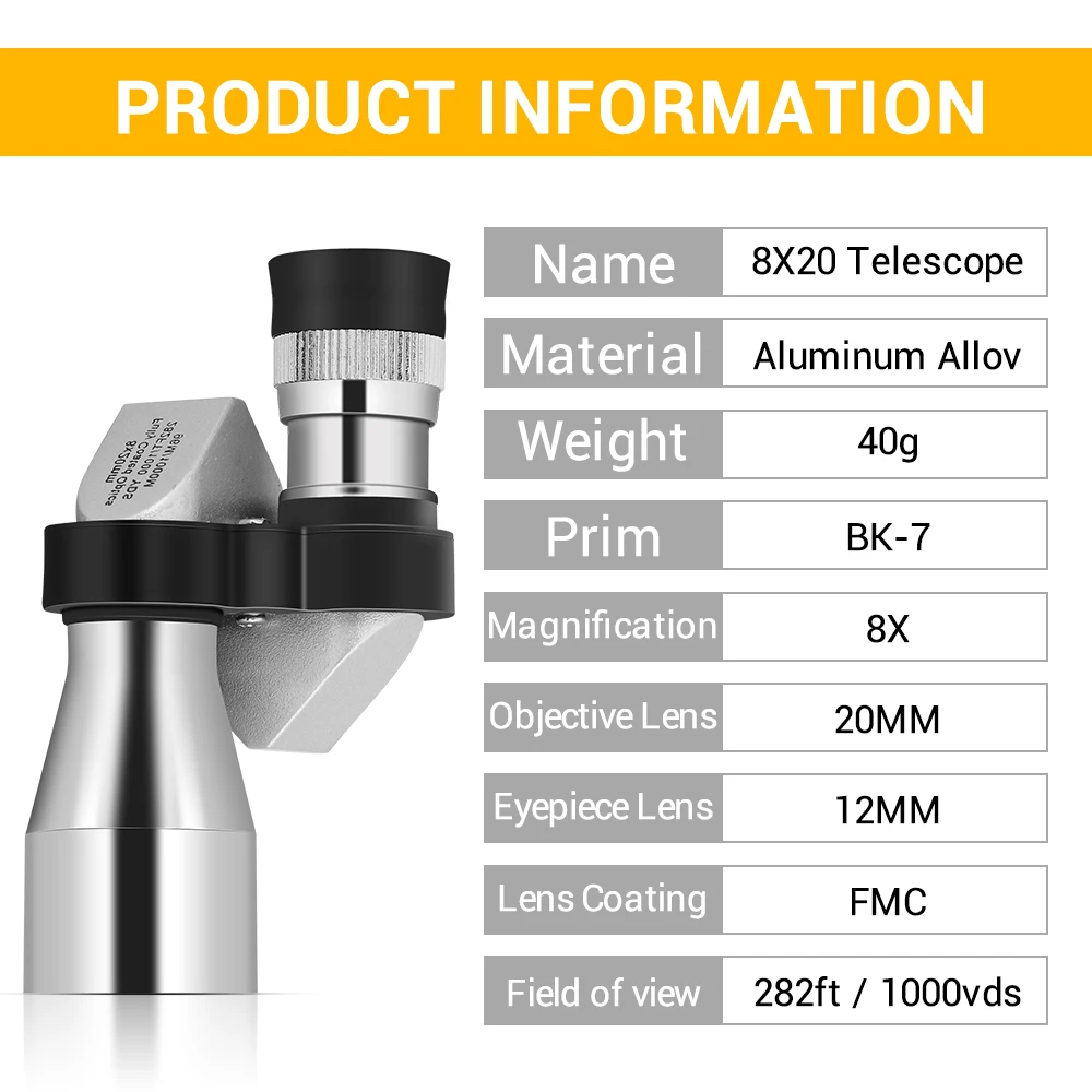 2. Этот монокулярный Монокуляр размером 8x20 с катадиоптрическим дизайном является мощным инструментом для альпинизма, пешего туризма. Это лучший Одноглазый телескоп с большим увеличением для взрослых и детей.
