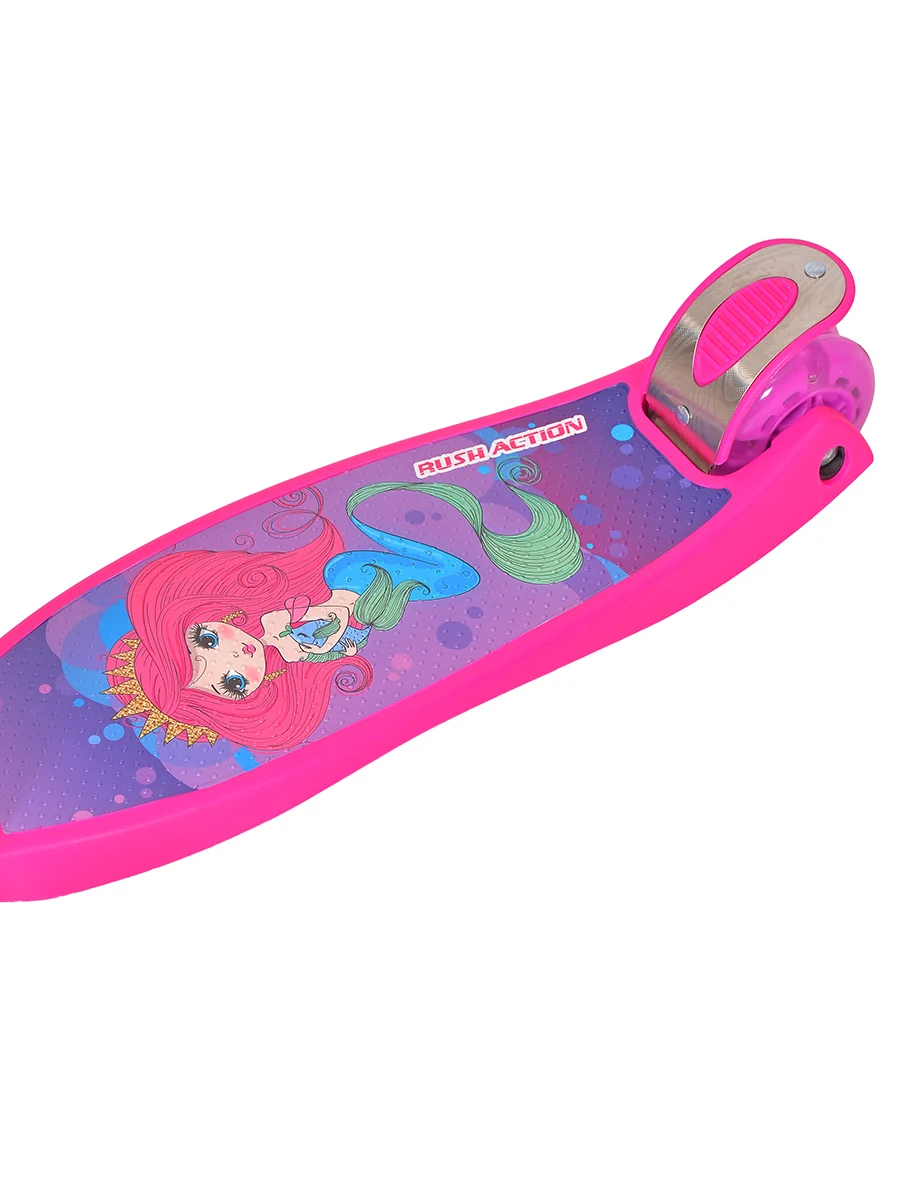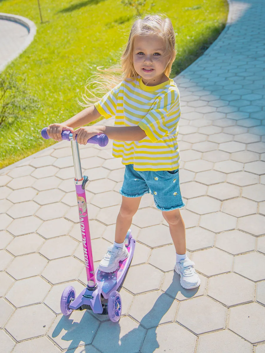 Детский 3-х колесный самокат с максимальной нагрузкой 40 кг. Самокат с системой управления "наклоняй и поворачивай" идеально подходит для малышей, которые только учатся кататься на самокате. Регулируемая высота алюминиевого руля от 65 до 90 см. Полиуретановые светящиеся колёса жёсткостью 82А. Диаметр колес 120 мм, 80 мм. Подшипники ABEC 7 обеспечивают хорошее скольжение. Широкая платформа исключает риск травмирования ребенка. Тормоз задний - наступающий (step-on brake). Вес самоката 2,6 кг.
