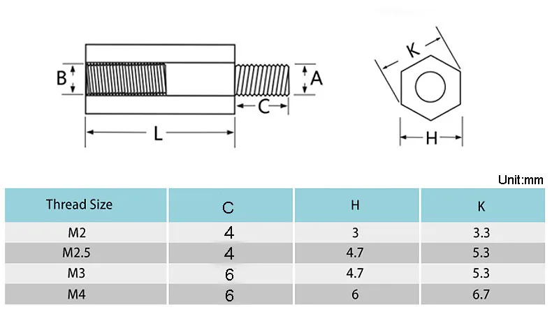 Длина резьбы M2/M2.5 C = 4 мм