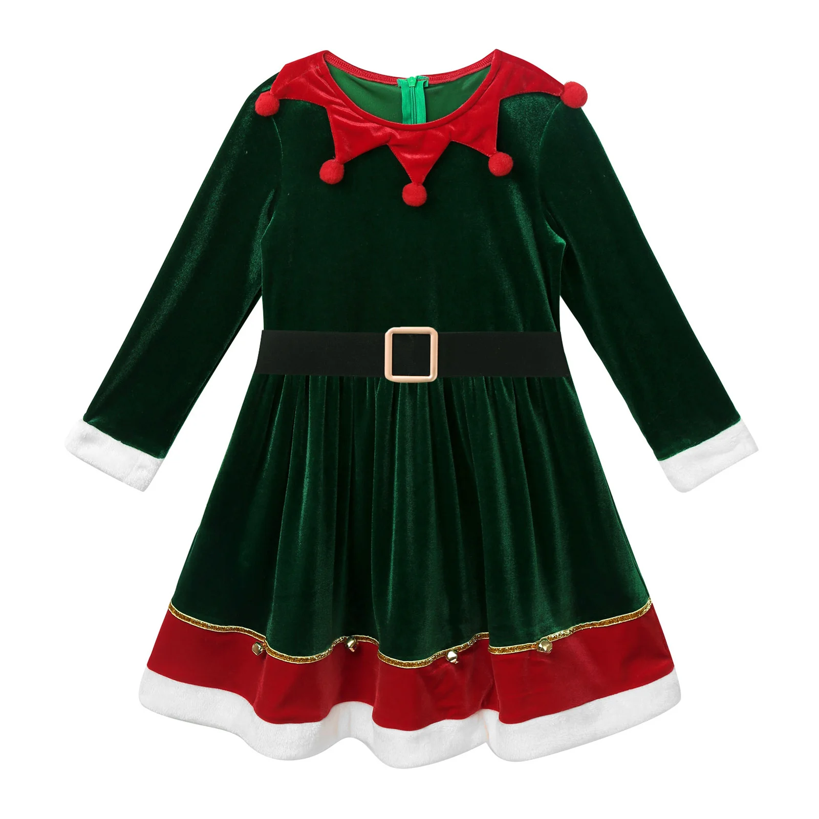 Тонкое бархатное платье с одним слоем, золотым подолом, украшенным колокольчиками, с натянутым подолом. Идеально подходит для рождественских праздников для маленьких девочек и больших девочек.