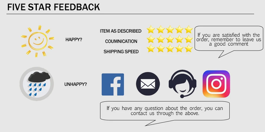 Если вы не удовлетворены товарами, пожалуйста, не стесняйтесь связаться со мной для решения, а не оставлять нейтральные или негативные отзывы, мы постараемся сделать все возможное, чтобы решить проблему. Пожалуйста, оставьте положительные отзывы и 5 звезд, если вы удовлетворены нашими товарами и услугами. :) Спасибо вам