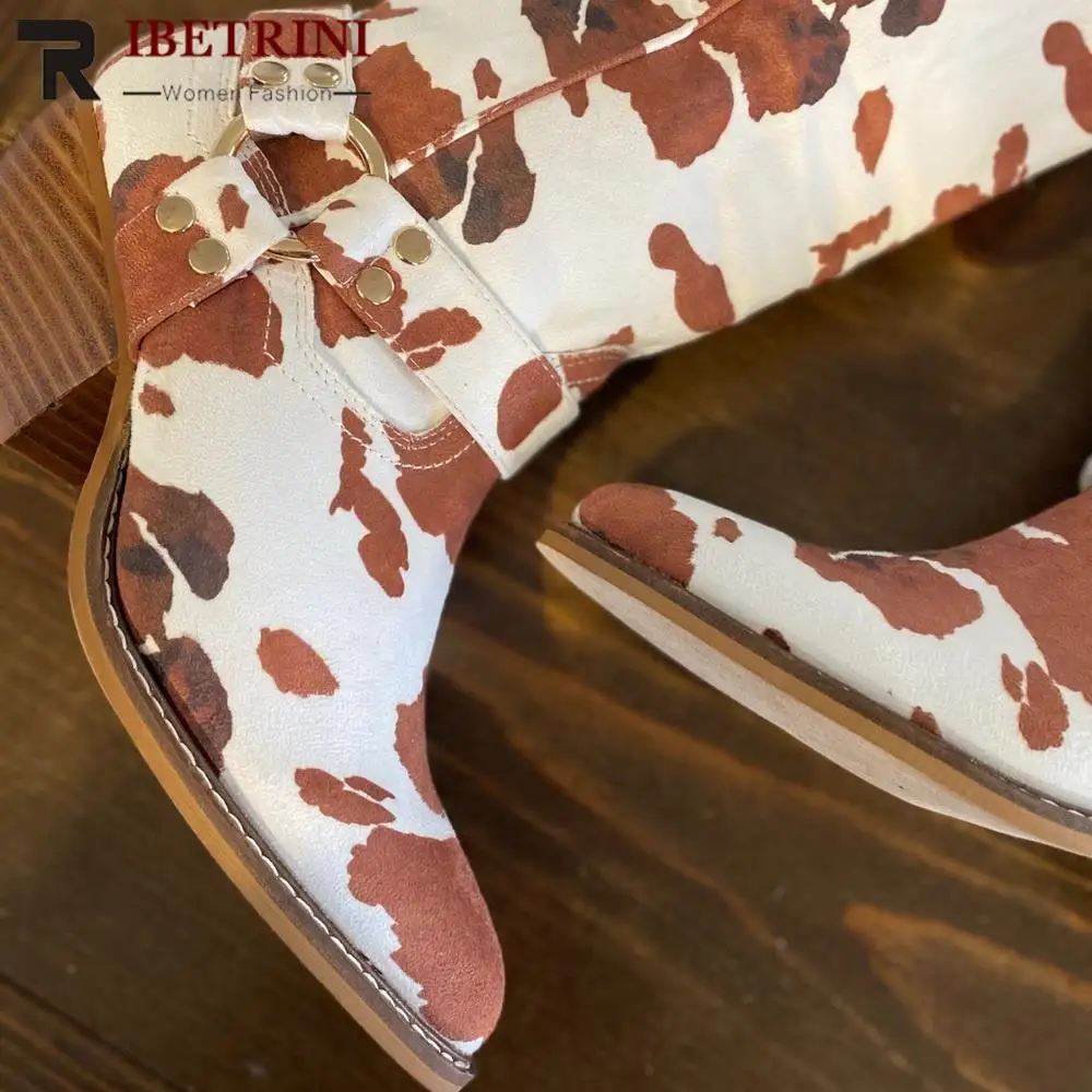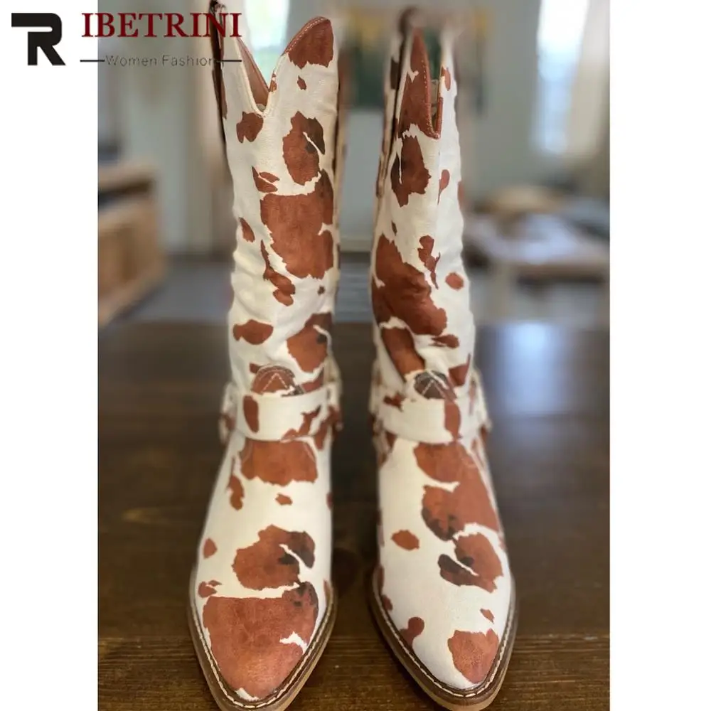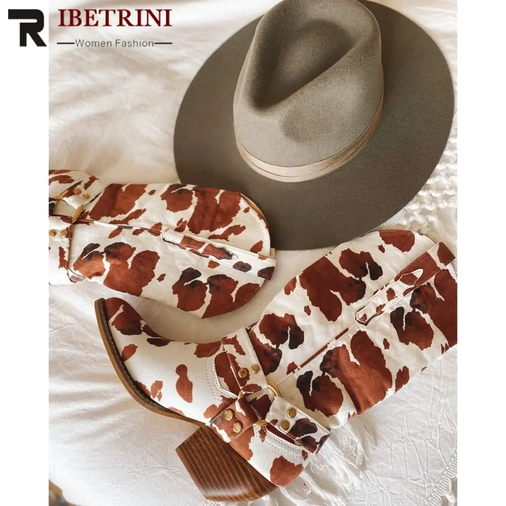 Женская обувь «Челси»; Из флока; С принтом коровы на не сужающемся книзу массивном каблуке с острым носком в западном стиле удобные ботинки на каждый день; Новая женская обувь 2021 горячая Распродажа, модная обувь