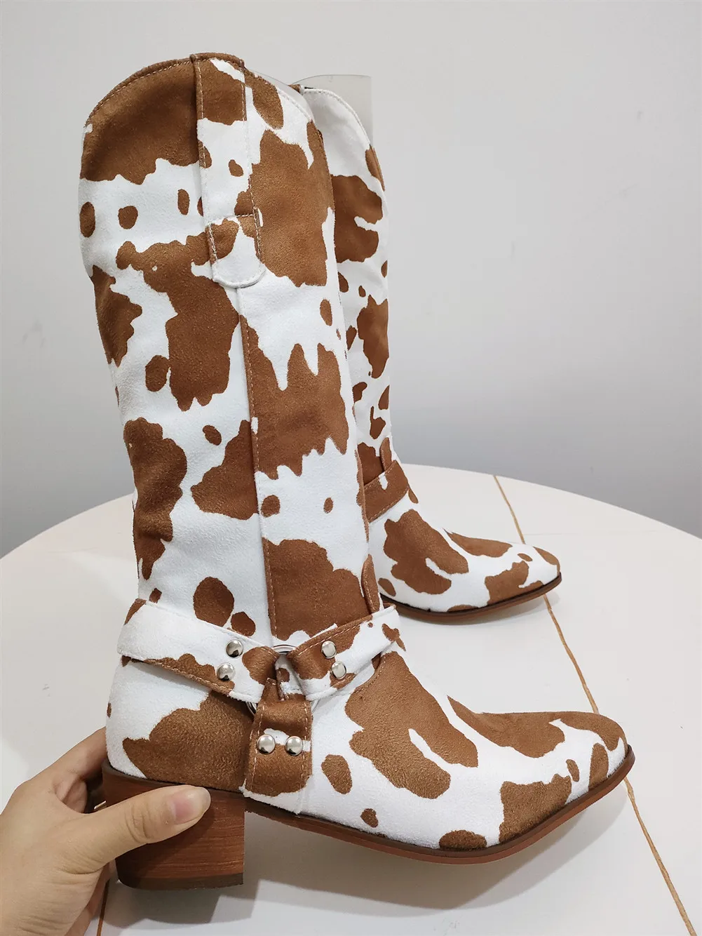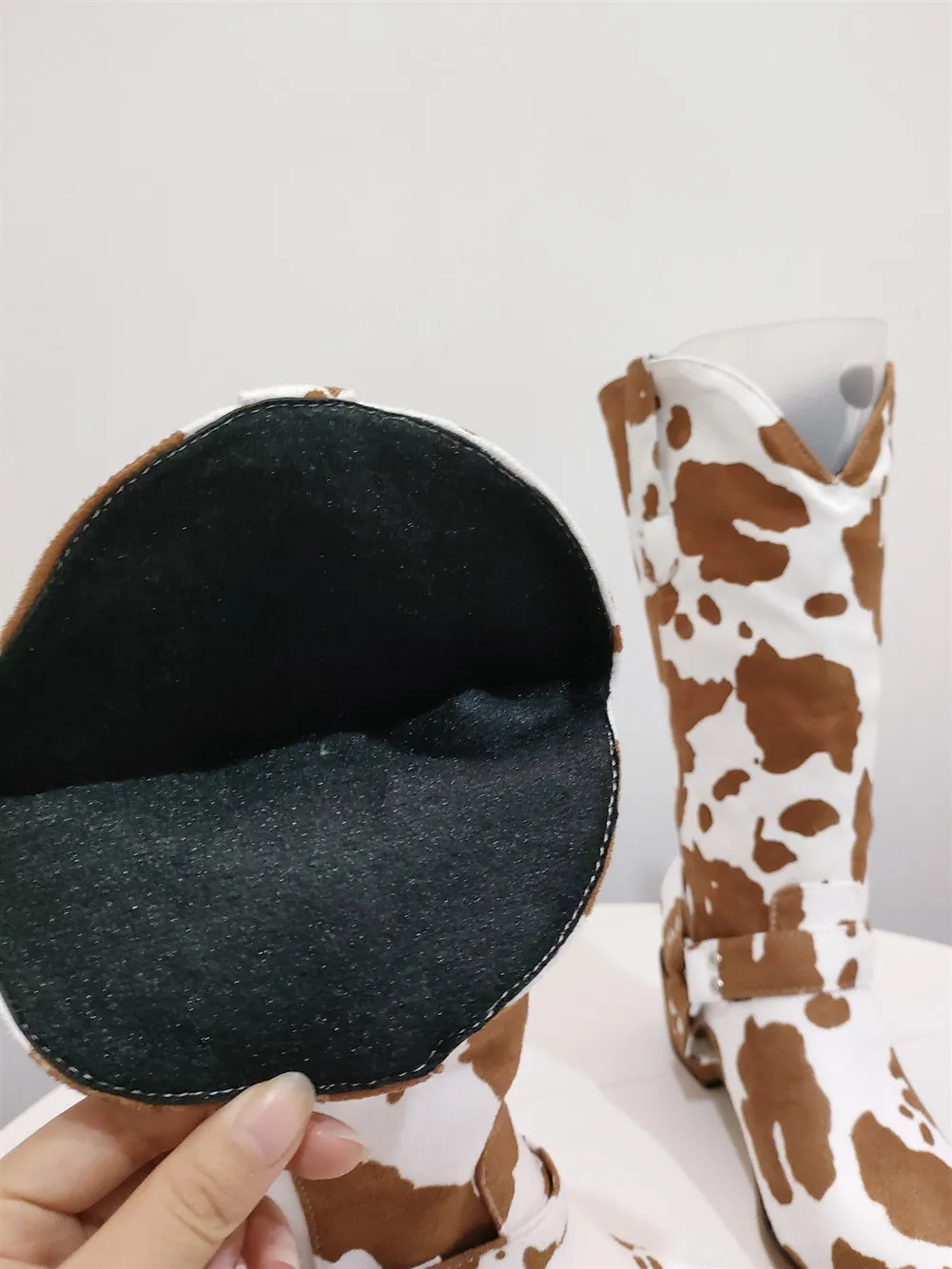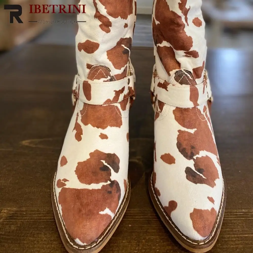 Женская обувь «Челси»; Из флока; С принтом коровы на не сужающемся книзу массивном каблуке с острым носком в западном стиле удобные ботинки на каждый день; Новая женская обувь 2021 горячая Распродажа, модная обувь