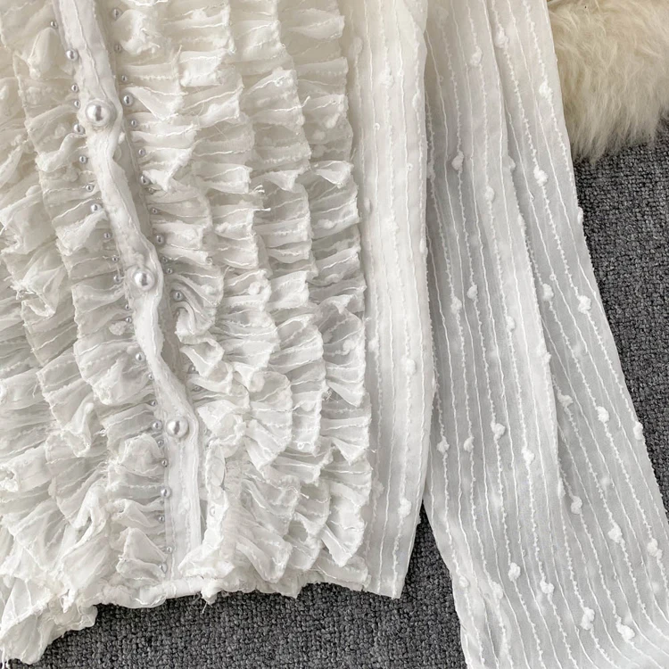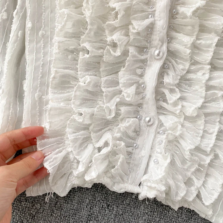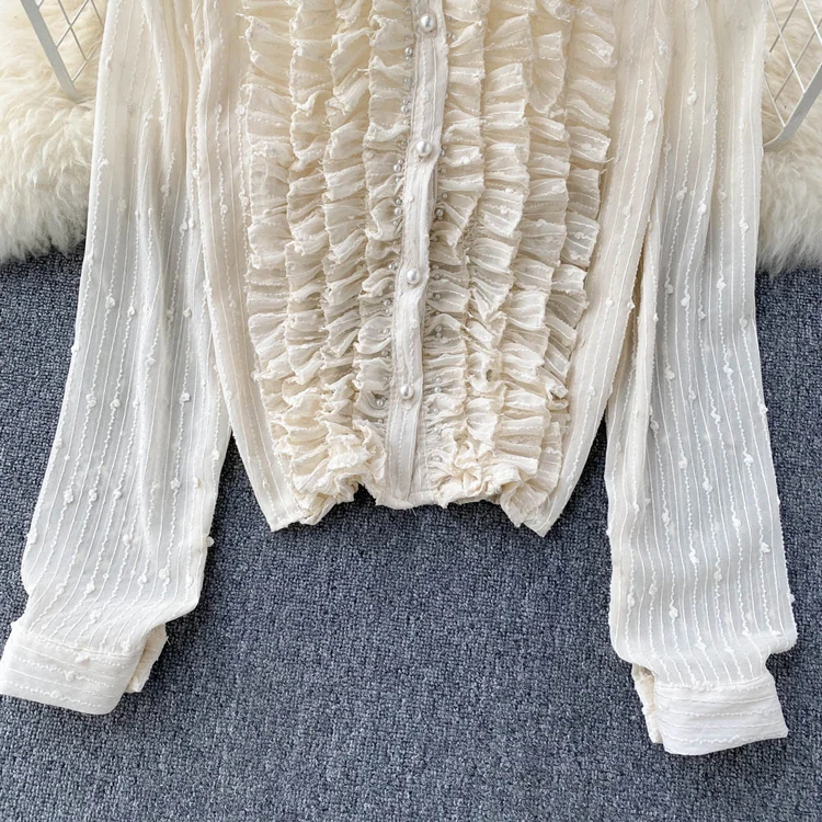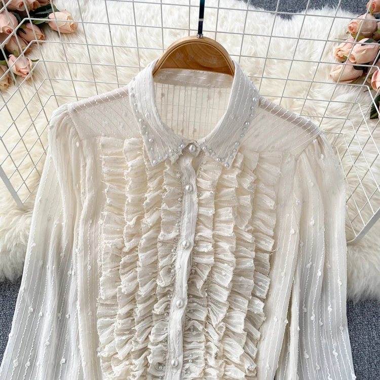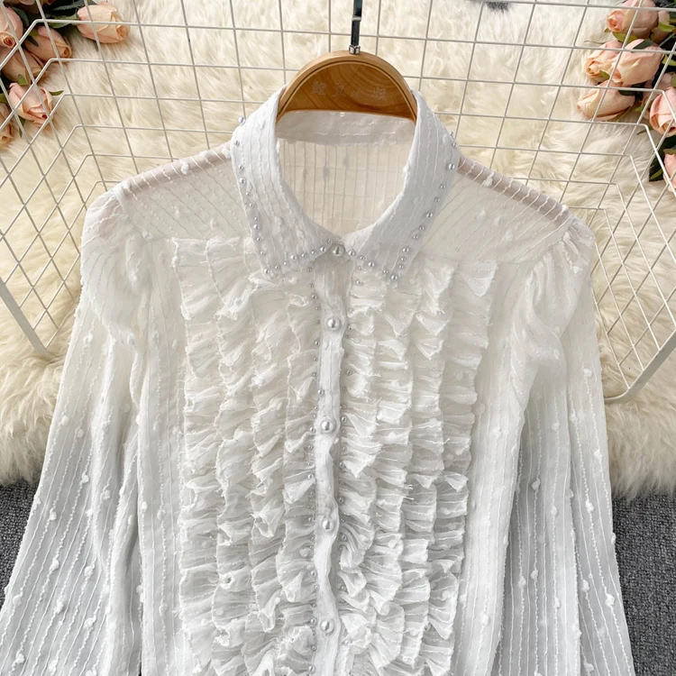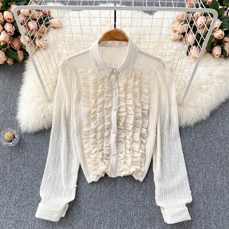 Новые весенние жемчуг бисер сетки блузки для женщин Сладкий с пышными рукавами газовое многослойное платье с оборками в стиле «лолита» шифоновые блузки плюс женские элегантные рубашки топы