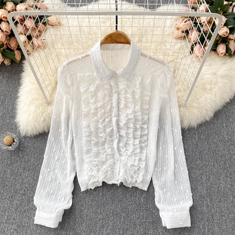 Весенние новые сетчатые блузки с жемчугом и бисером, женские милые марлевые блузки с пышными