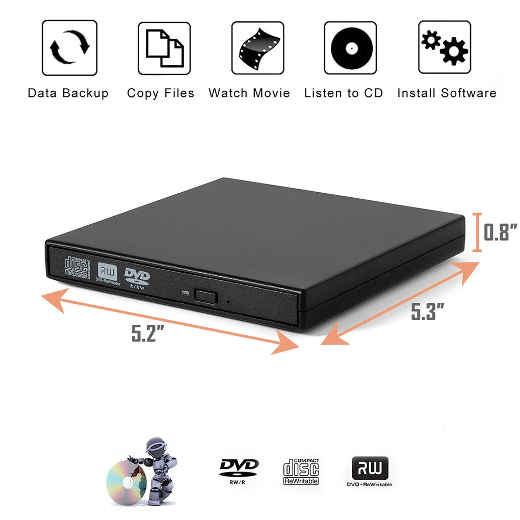 Высокопроизводительный интерфейс USB 2,0: с этим внешним CD-накопителем для ноутбука, он обеспечивает быструю скорость передачи данных и стабильную производительность. Вы можете записывать CD, музыку, видео, устанавливать программное обеспечение или создавать резервный диск CD/DVD.