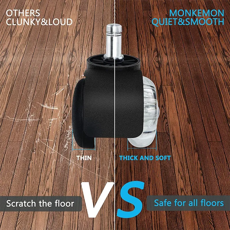 [Безопасная защита для всех полов]: эти колеса для офисных стульев покрыты сверхтолстым полиуретановым слоем и гарантированно не царапаются и не оставляют следов на любой поверхности даже без использования коврика для стульев. 100% безопасное скольжение по паркетному полу, ламинату, линолеуму, плитке, ковру с коротким ворсом. (Не рекомендуется использовать на коврике с шерстью более 2 см)