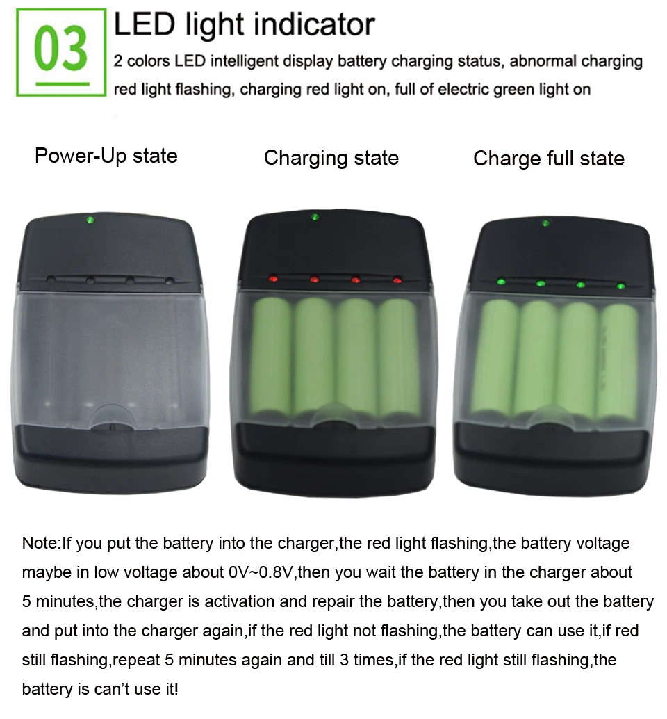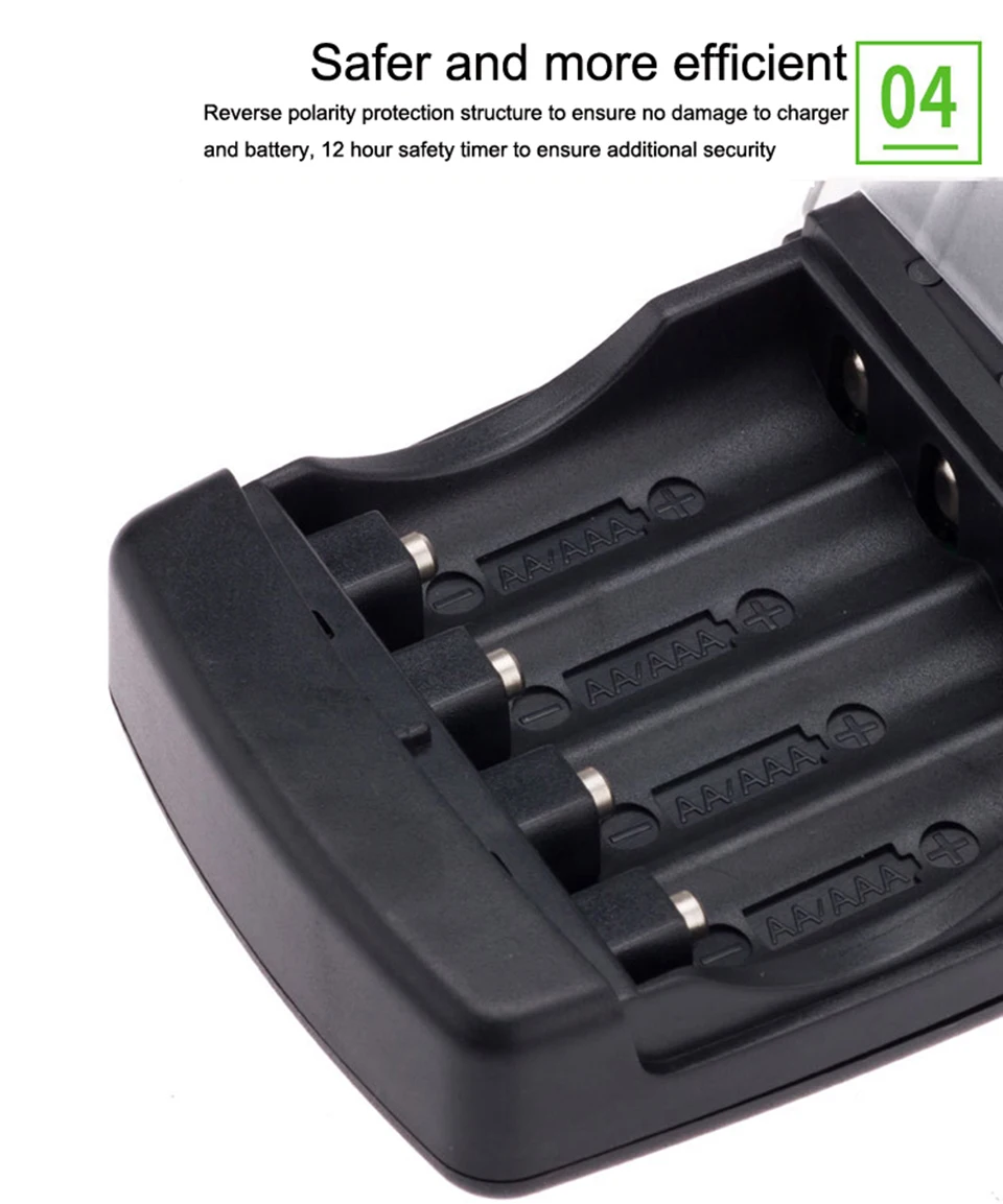 1. 4 полностью независимых способа. Индивидуальная схема зарядки для каждого аккумулятора. Безопасно заряжать от 1 до 4 Ni-MH/CD AA или AAA AAAA батареи любого производителя или производителя. Смешанные и Подходящие типы аккумуляторов, зарядка аккумуляторов AA и AAA с разной емкостью одновременно.