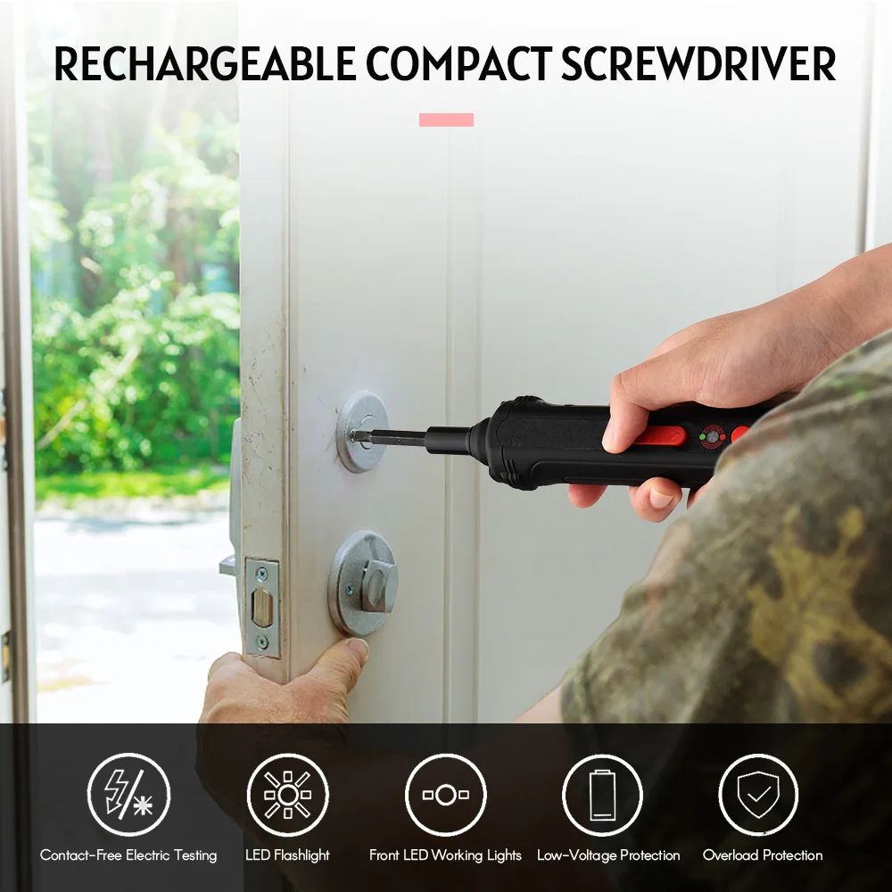 Cordless screwdriver lightweight and easy to handle. Equipped with front 2 LEDs working light and rear flashlight, and 19 pieces screwdriver bits. Multiple requires, one solution. Perfect for small DIY work, decoration work, maintenance work, etc.