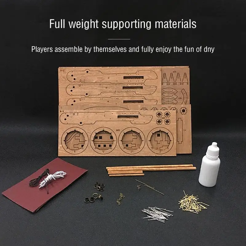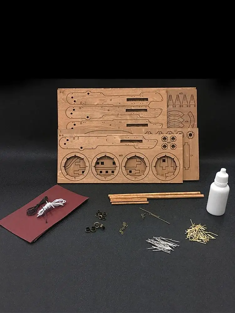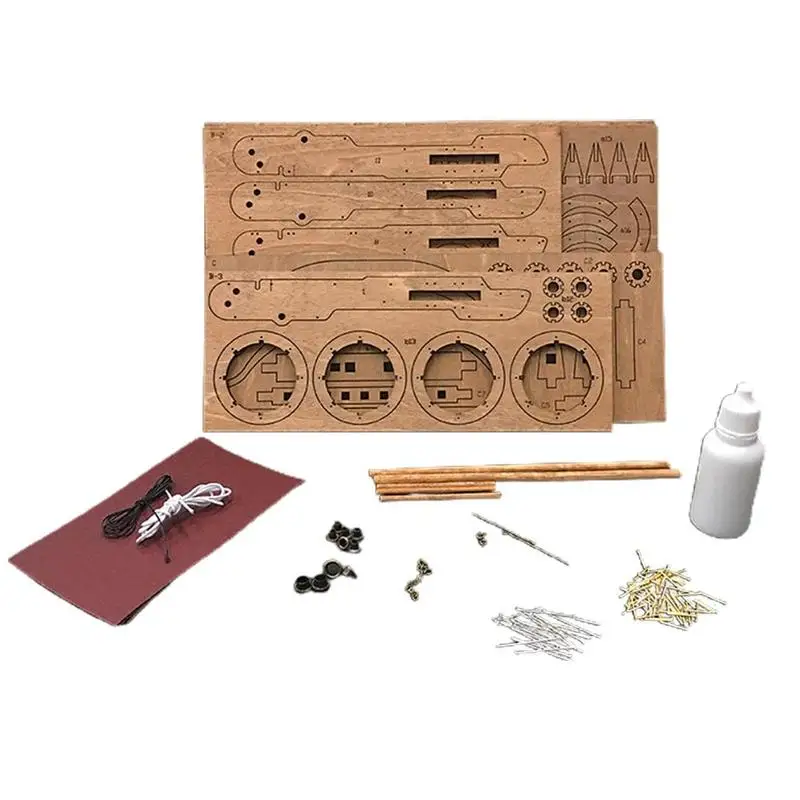 1 Набор собранных деревянных досок, достаточное количество деталей для сборки, 1 руководство по использованию бумаги, 4 наждачных бумаги, 1 бутылка белого латекса или спиртового клея и 3 деревянные стрелки