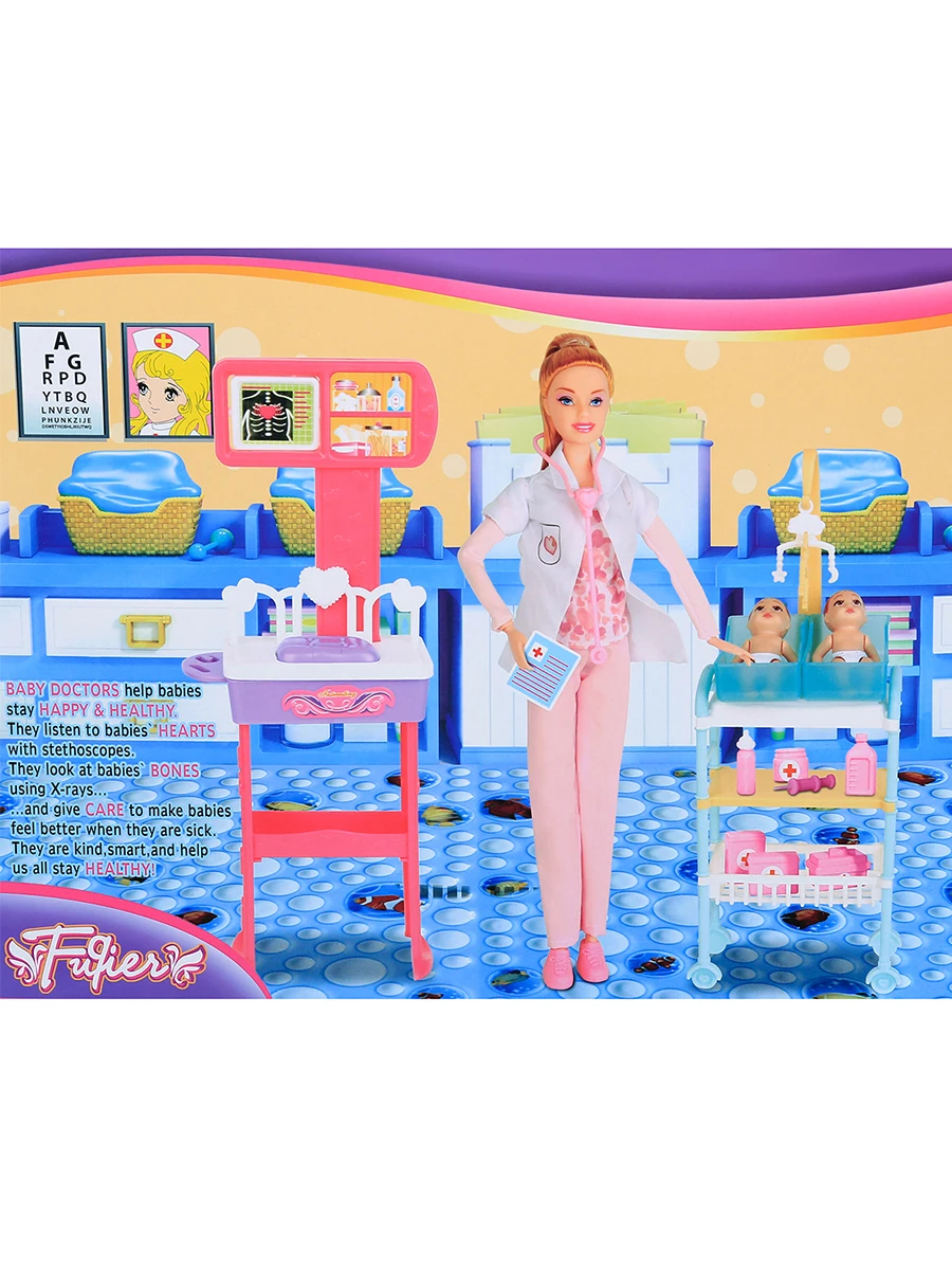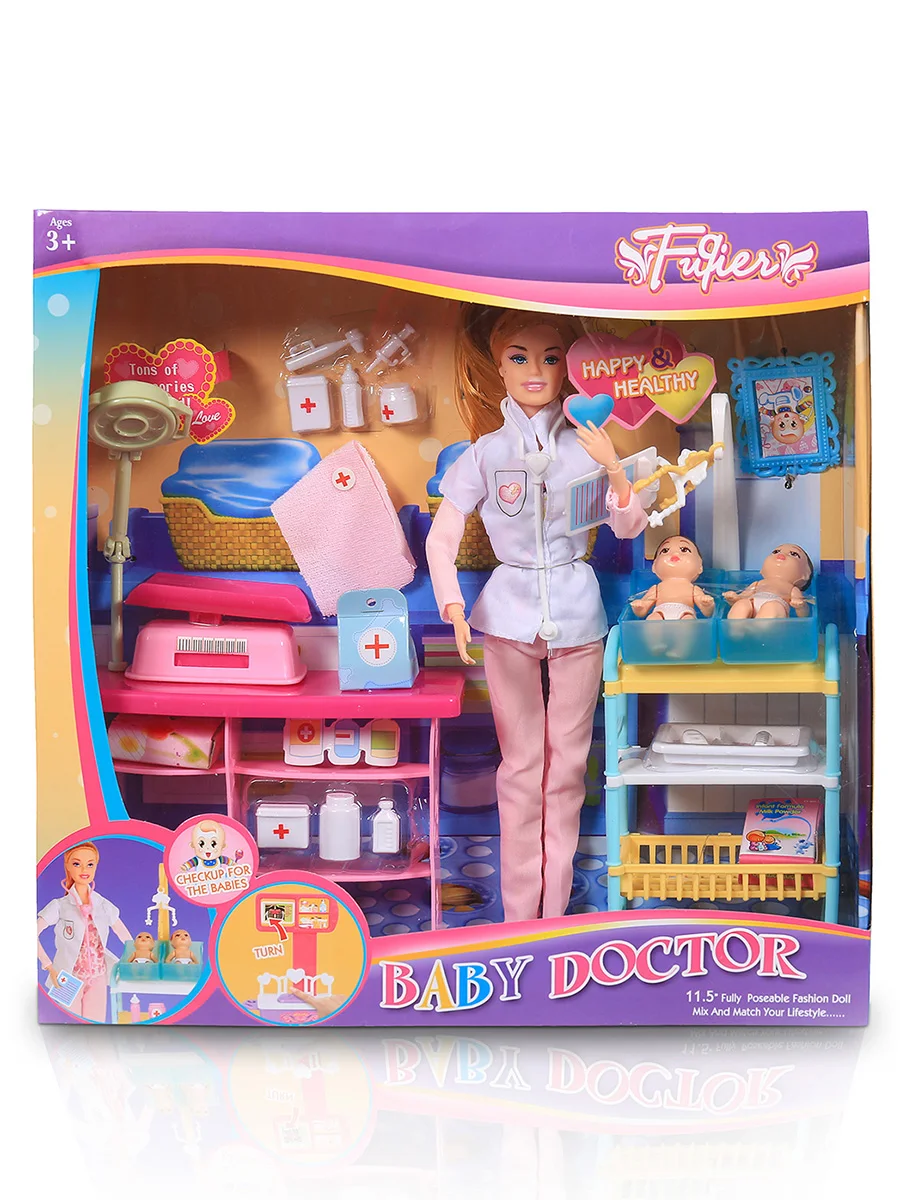 Набор из 3-х кукол не только разнообразит сюжетно-ролевые игры ребенка, но и расширит его познания о мире профессий. Для начинающего врача в комплекте имеется все необходимое: маленькие пациенты, стойки с различными приборами. Сама доктор одета в медицинскую форму, а на ее шее висит неотъемлемый атрибут врача - стетоскоп. Кукла довольно подвижна и может принимать различные позы. Почувствовать себя умным доктором и оказывать помощь своим игрушечным пациентам - увлекательное занятие. Этот набор непременно понравится ребенку, а возможно, окажет влияние на выбор будущей профессии.