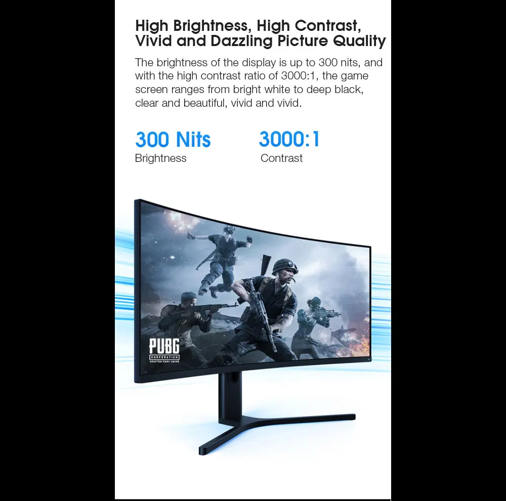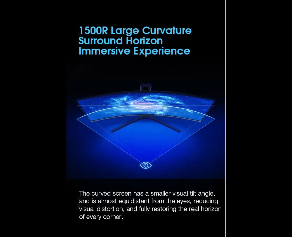 ●1500р Большая кривизна окруженная визуальное поле, Дает вам захватывающий опыт. Очень Большая кривизна 1500R's, линия зрения окружена экраном, показывая панорамный вид общего погружения; Изогнутый экран имеет меньший визуальный угол наклона, И глаза почти одинаковы, уменьшая визуальное искажение, полностью восстанавливая истинные горизонты каждого угла.