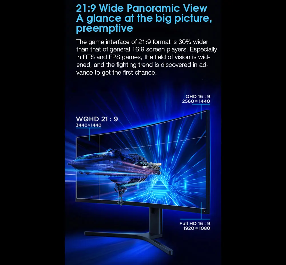 ●21:9 широкий панорамный вид. 21:9 формат игрового интерфейса на 30% шире, чем средний 16:9 поле зрения экрана игрока, особенно в RTS и FPS играх, поле зрения чрезвычайно широкое.