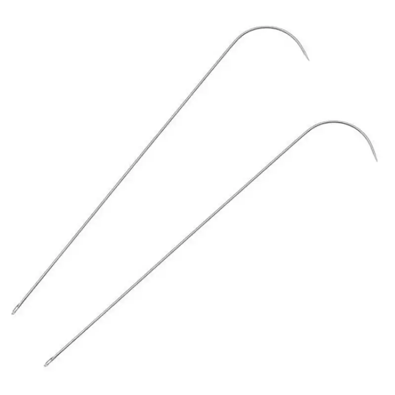 Около 7,5 см (не включая изогнутые крюк), игла голенища составляет около 0,6 мм толщиной, и игольное ушко составляет около 0,75 мм шириной.