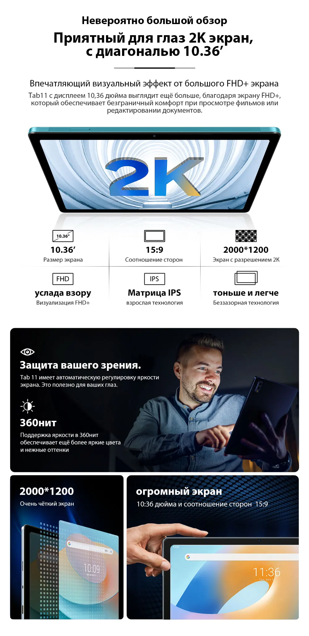 Экран --------10,36 дюймов 1200*2000 пикселей FHD +