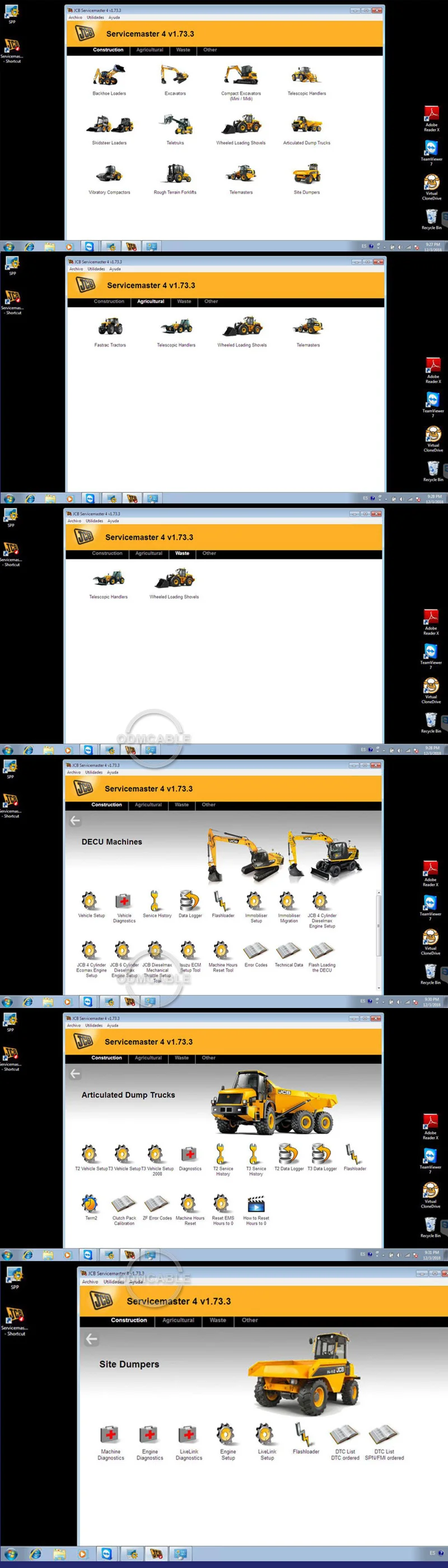 Сервис JCB Master также предоставляет несколько ключевых функций, которые будут сопровождать все проекты JCB, инструмент для редактирования нескольких языков, который предоставляет средства индивидуального перевода текста для всех приложений JCB и средства для выбора локализованного языкового перевода для каждого приложения JCB.Поддерживаемые модели и двигатели: JS Range, JZ70, экскаватор-погрузчик, Loadall 2007-, Loadall 2007 , Loadall Agri дополнительные приложения, Loadall строительные приложения, робот, Teletruk, Midi экскаватор 801-8065, 8080-8085, самосвал, большое колесо загрузки лопаты, компактные колеса загрузки лопаты, Fastrac 2000-3000 серии, Fastrac 3000 серии 2, Fastrac 8250 Series 1, Fastrac 8250 Series 2, Fastrac 7000 Series 1, Vibromax, JCB дизельмакс двигатель, JCB двигатель (IPU OEM), JCB двигатель (базовый двигатель OEM), JCB генераторы, liveLink I, LiveLink II.