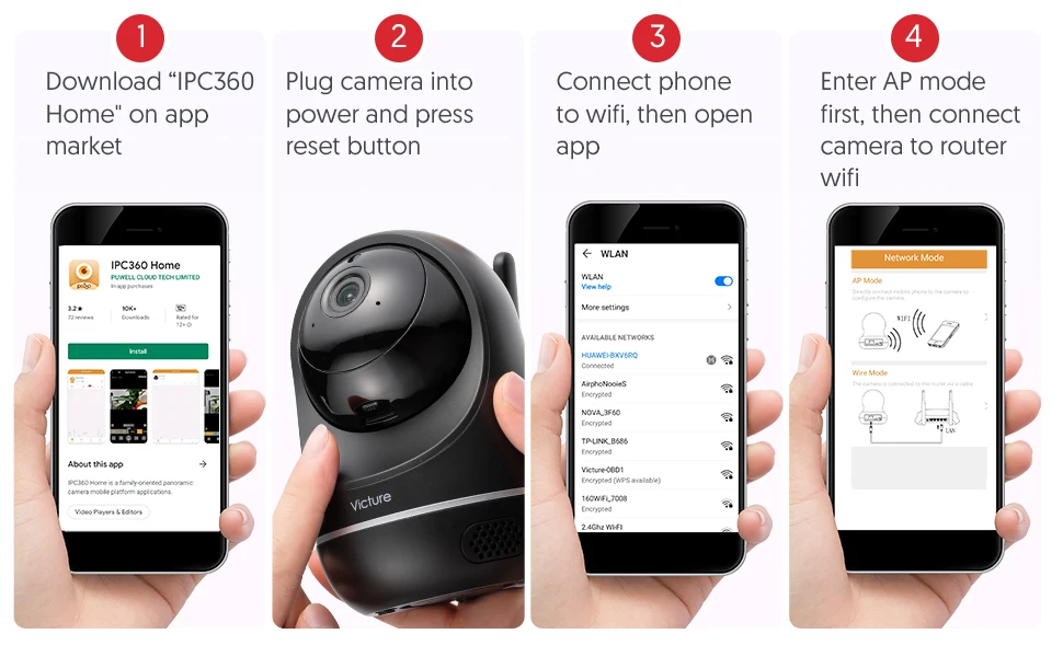 [Простая установка Wi-Fi и дистанционное управление с помощью приложения для телефона] оставьте эти грязные и смешанные провода, настройте свою систему безопасности в считанные минуты. Пожалуйста, загрузите приложение «IPC360 Home», вы можете свободно контролировать угол камеры