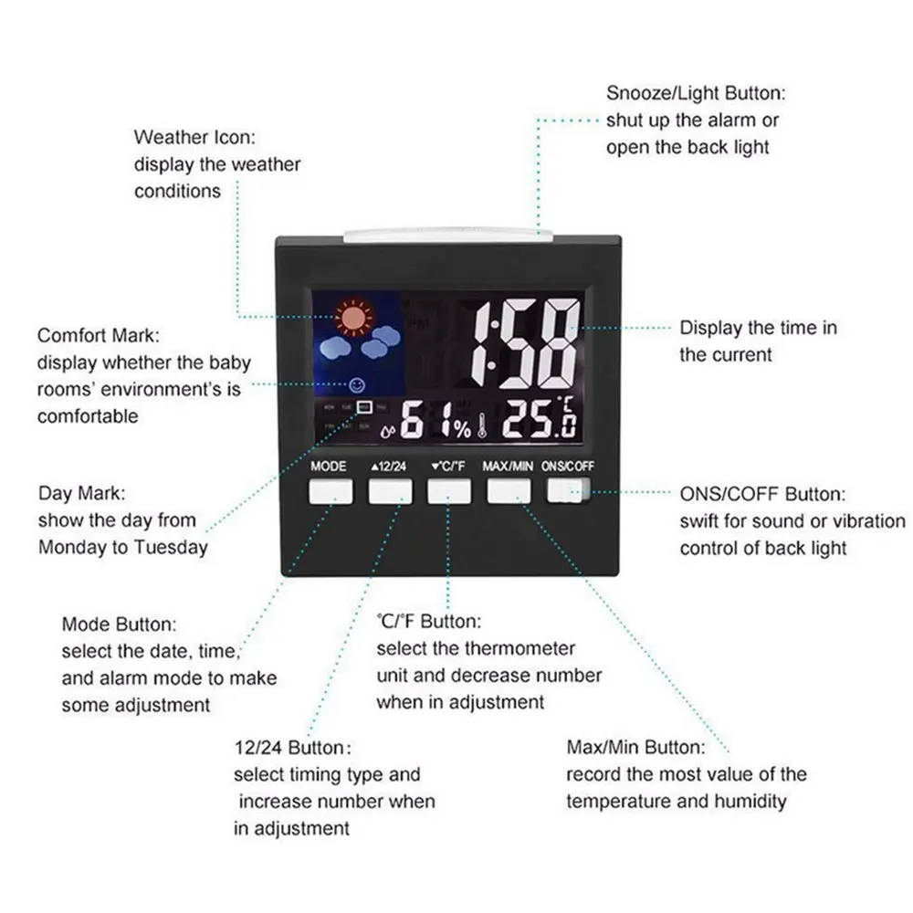 1. Функция прогноза погоды. С функцией имитации прогноза погоды, текущий климат можно оценить в соответствии с температурой и влажностью.Посылка включает в себя: будильник температуры и влажности * 1
