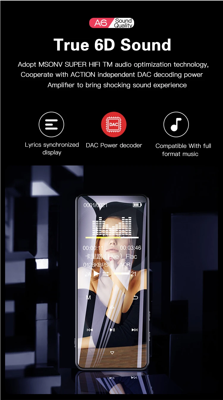 Adopting for MSONV super hifi tm audio optimization technology, companied with ACTION and DAC decoding amplifier to bring you excellent 6D music performance, supporting lyrics displaying function.