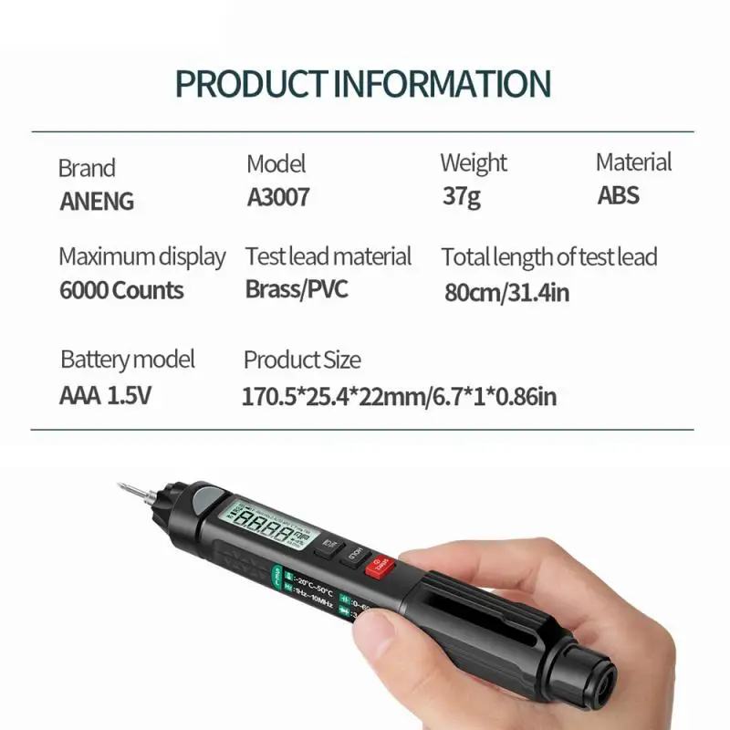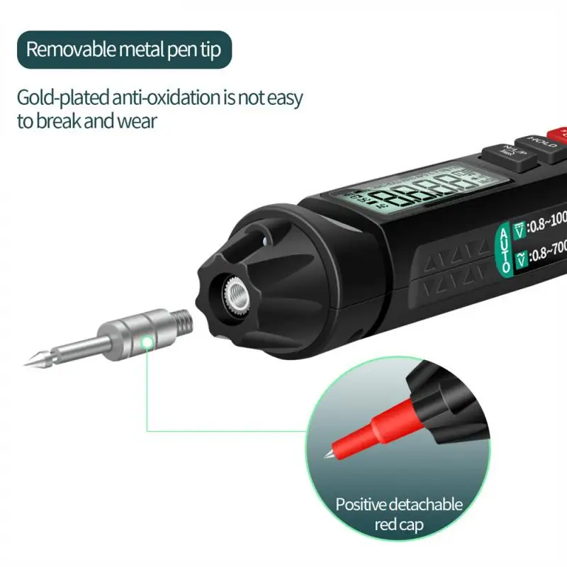 Универсальный мультиметр-ручка: Этот мультиметр отличается испытанием сопротивления/емкости/диода/частоты/температуры, непрерывности, нулевой линии и Бесконтактного обнаружения напряжения и т. д.