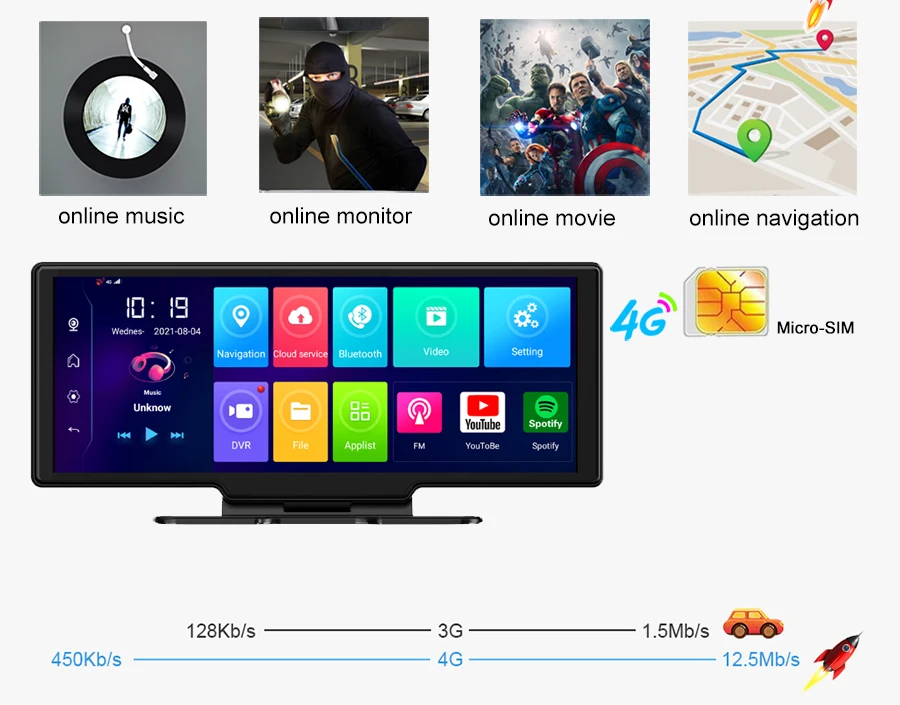 Благодаря sim-карте 4G и встроенному Wi-Fi, независимо от того, где вы едете, вы будете наслаждаться удовольствием от интернет-серфинга, что делает его возможным для онлайн-навигации/музыки/кино и т. Д.Примечания: перед размещением заказа, пожалуйста, проверьте, находится ли ваша локальная сеть sim-карт ниже полос или нет:(4G/LTE:FDD,2100(B1)/1800(B3) GSM:900(B8)/1800(B3)Удаленный монитор и GPS регистратор слежения