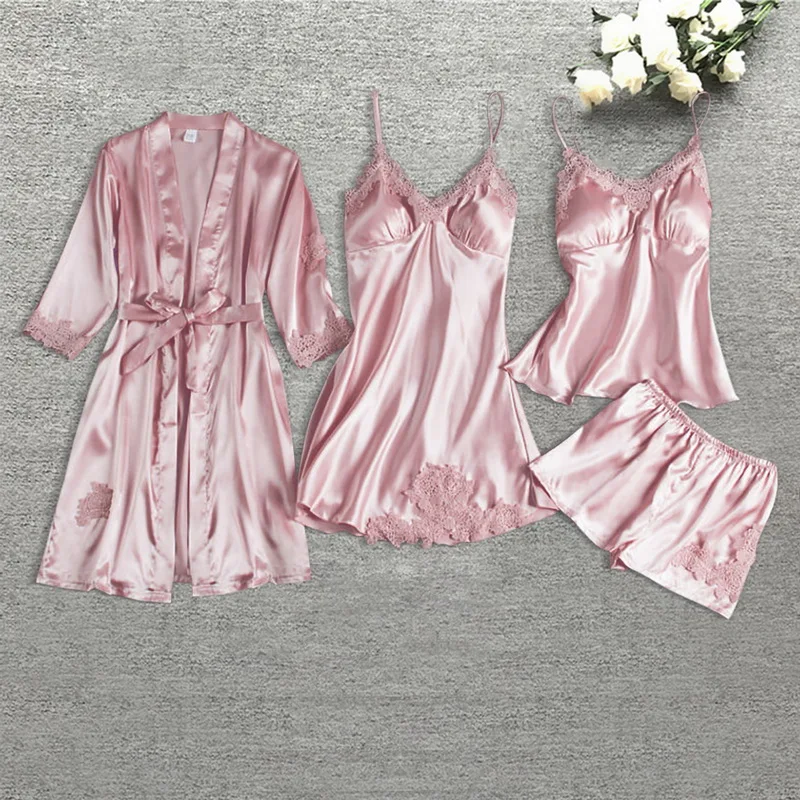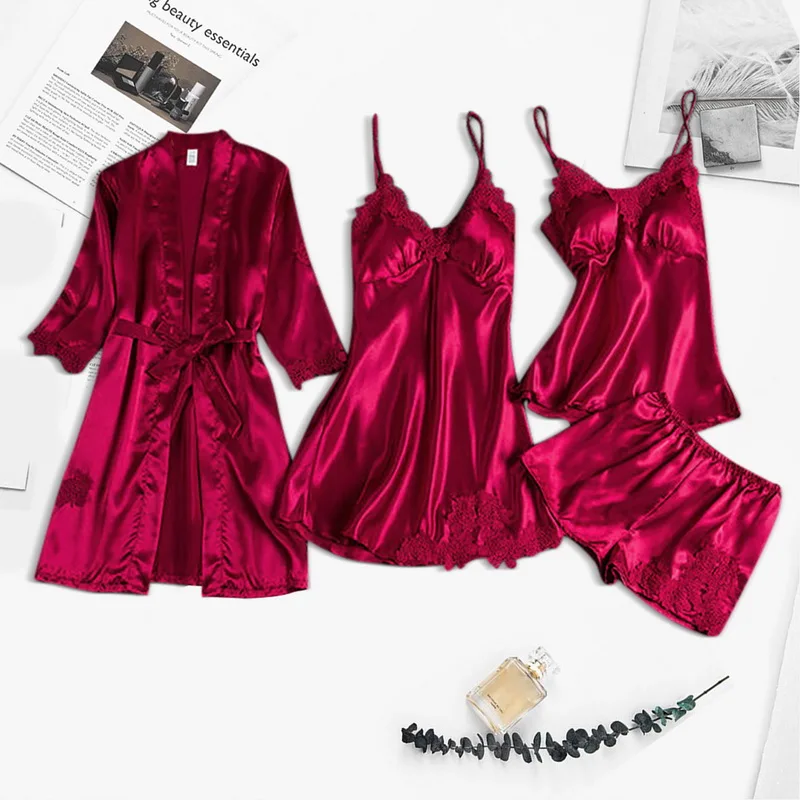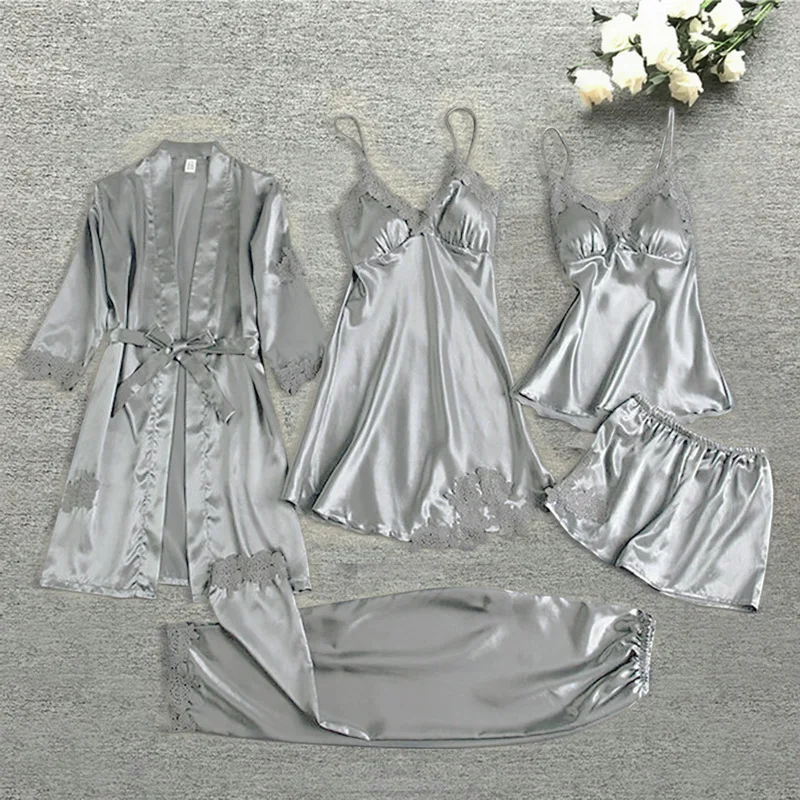 Сексуальная ночная рубашка из пяти частей, пижамы, пижамные топы, наборы халатов, шелковые пижамы, Пижамный костюм для женщин, кружевные атласные пижамы, Пижамный костюм.