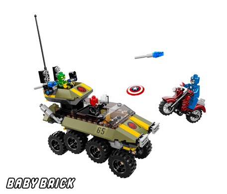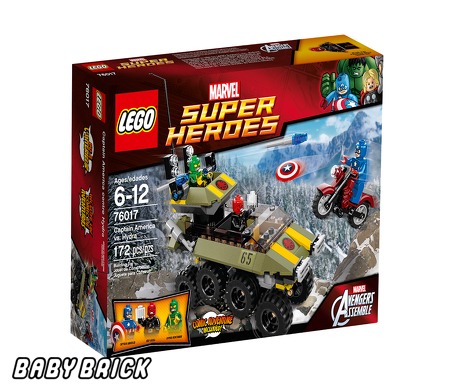 Конструктор торговой марки Lego «Капитан Америка против Гидры», выпущенный в рамках серии Супергерои (Super Heroes), рассчитан на детей до 12 лет. В наборе содержится 172 блочных детали, которые позволят воссоздать сцену противостояния персонажей всемирно известных комиксов. Результатом сборки имеющихся элементов станут яркие и красочные игрушки: скоростной байк главного героя и вооруженный бронетранспортер преступников. В комплекте предусмотрены 3 миниатюрные фигурки (Капитан Америка, приспешник Гидры и Красный Череп), а также дополнительные игровые аксессуары, подробная инструкция и книжка с комиксами.