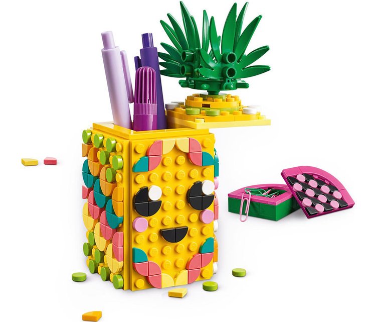 Вдохновите своего ребёнка на создание новых творческих проектов с помощью этого очаровательного декоративного органайзера для рабочего стола LEGO® DOTS™ (41906), включающего в себя высокую подставку для карандашей "Ананас" и маленькую коробочку для хранения канцелярских принадлежностей, выполненную в форме дольки арбуза. Игры начнутся, как только вы достанете набор из коробки!