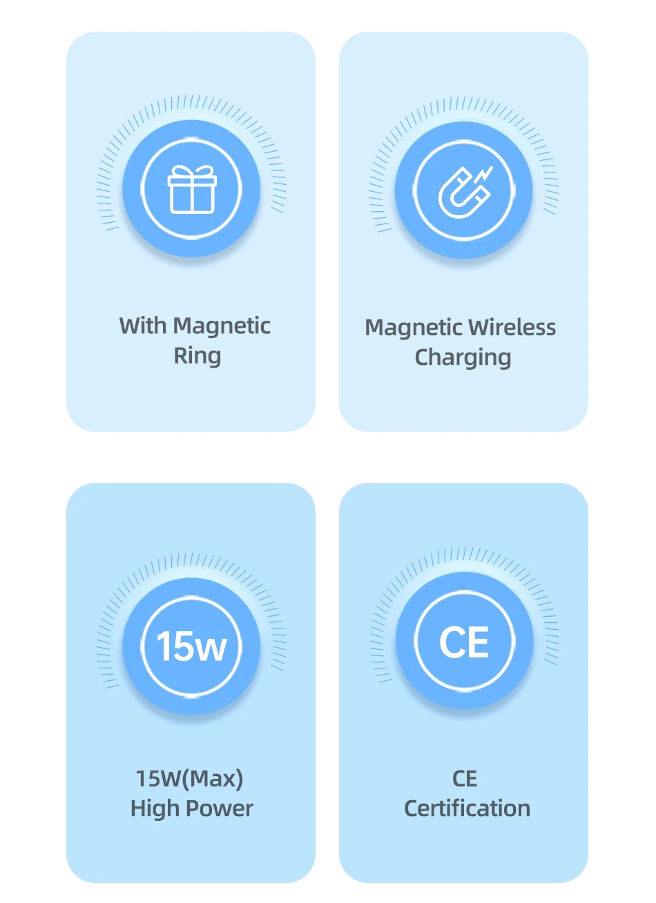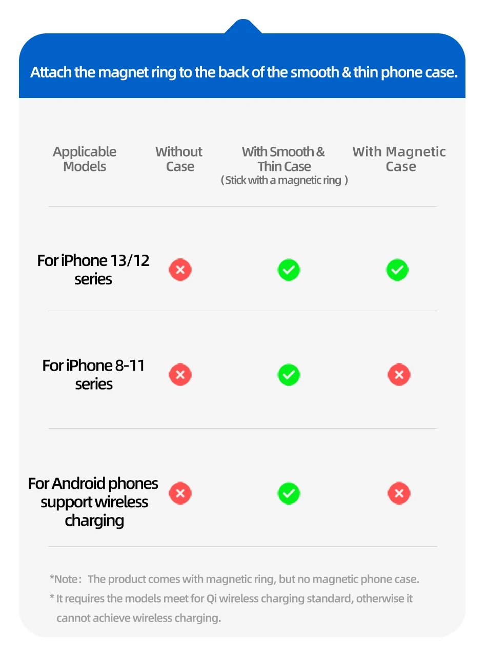 Используйте чехол для телефона и магнитное кольцо, модели с немагнитной функцией беспроводной зарядки также могут достичь магнитной беспроводной зарядки.