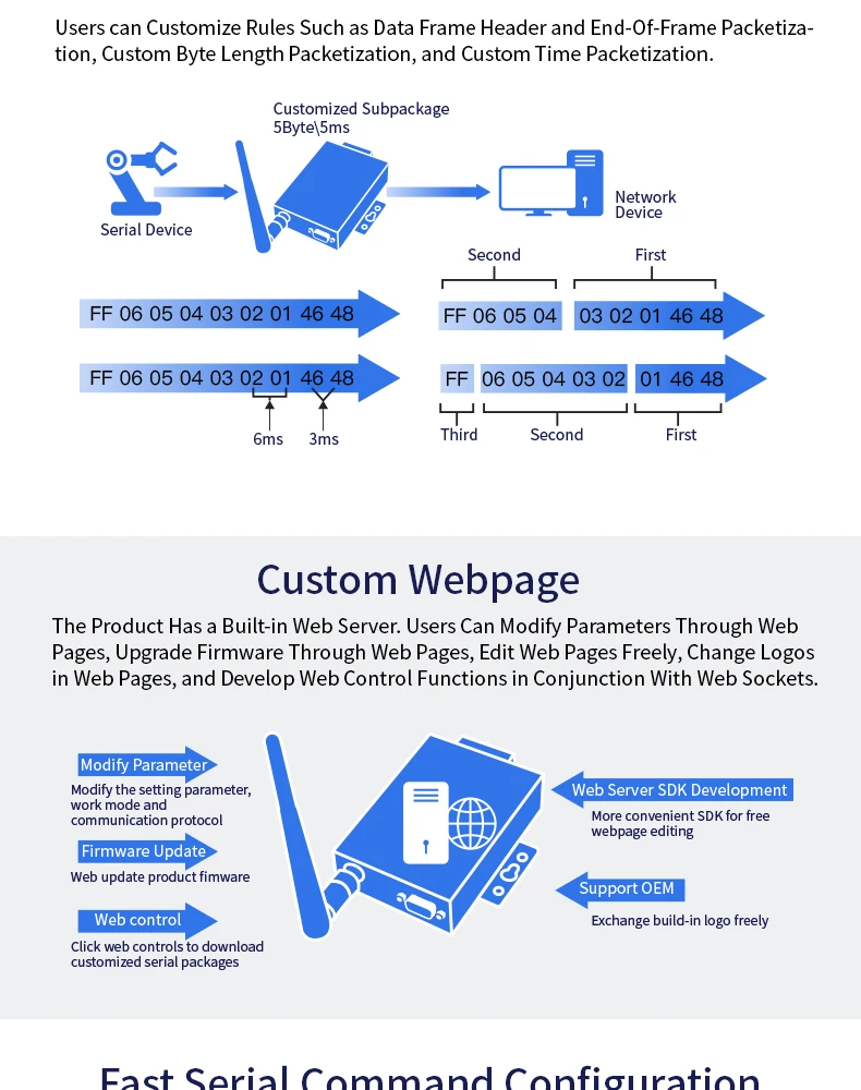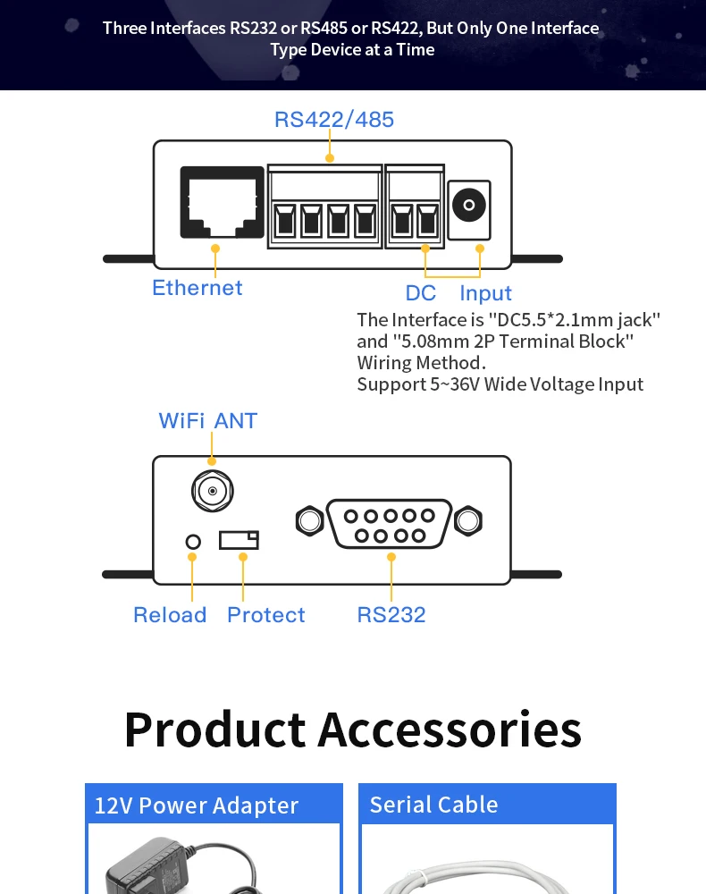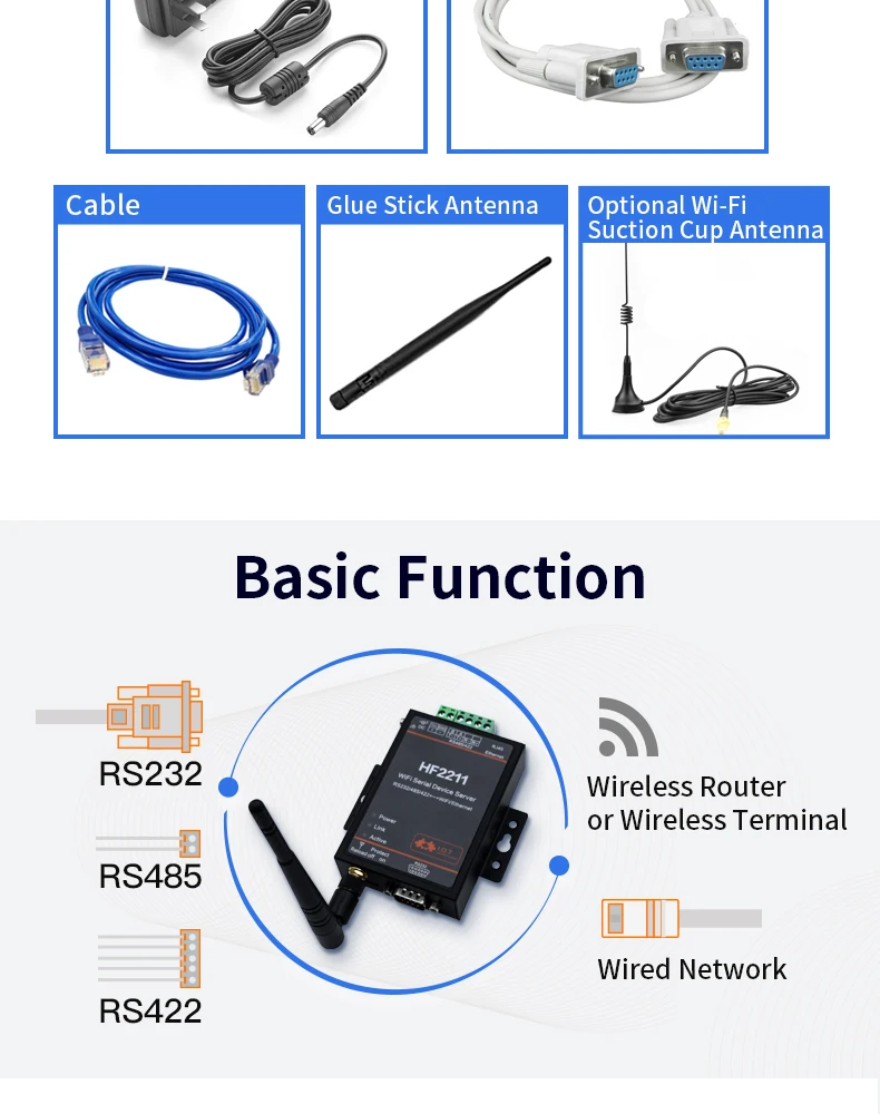 ² Поддержка 232/RS422/RS485 для преобразования Ethernet/Wi-Fi, последовательная скорость до 460800 bps