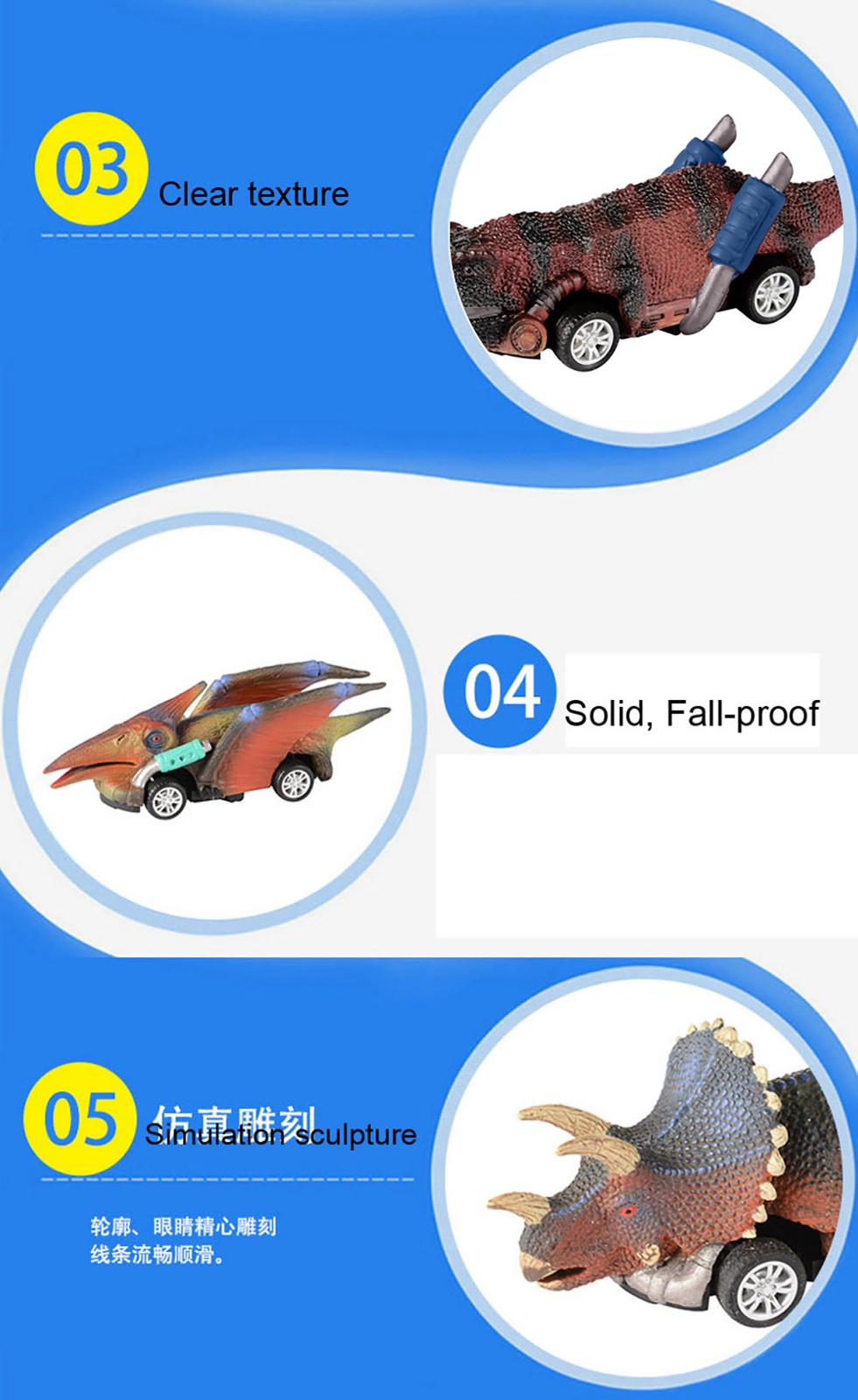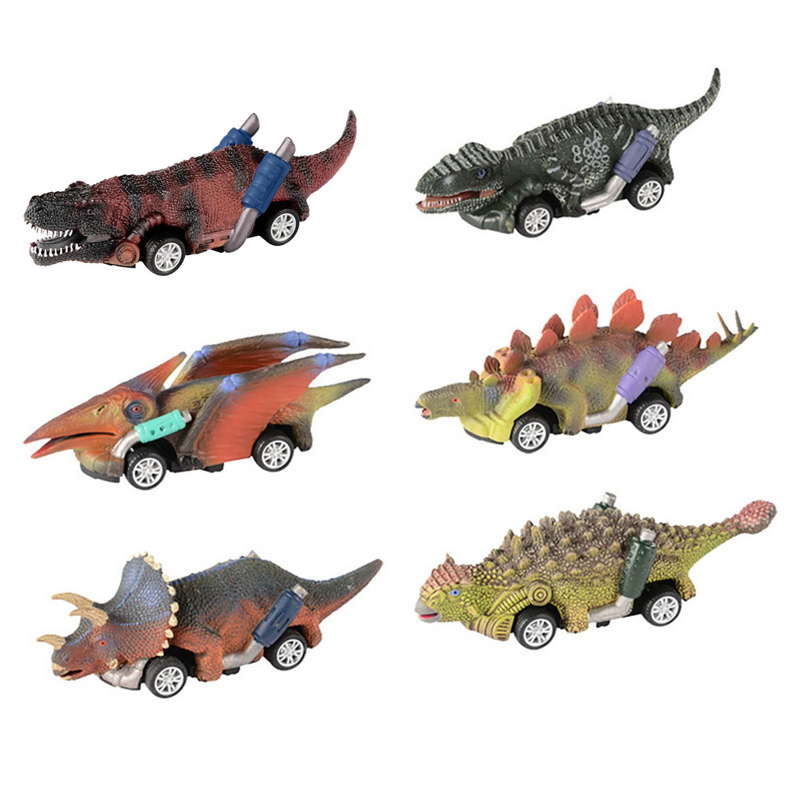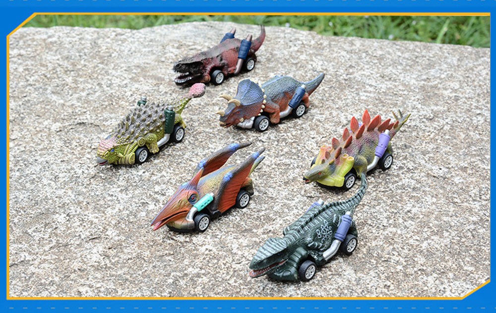 Creative Dinosaure CarsAll the 6 cars are in dinosaur shape (Triceratops, Velociraptor, Tyrannosaurus Rex, Stegosaurus, Pterosauria, Ankylosaurus), which is a great attraction to kids. Attractive Pull Back VehiclesPull back cars with big wheels, simply pull it back then it will go automatically, which makes great fun in party favors kids play.Package content: