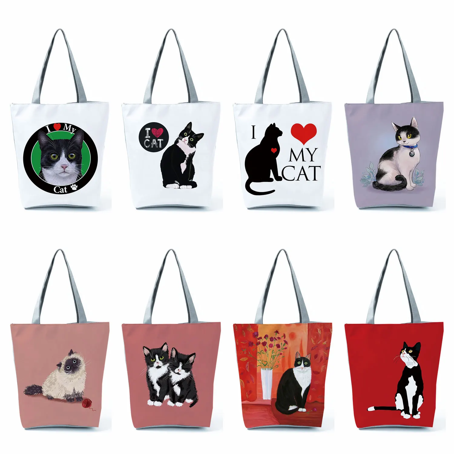 Черная сумка-тоут с котом, сумки, многоразовые сумки для супермаркетов, сумки для покупок для продуктов, женские сумки на плечо, пляжные сумки на заказ