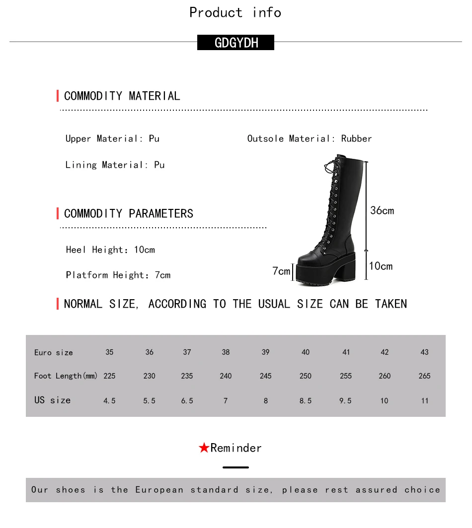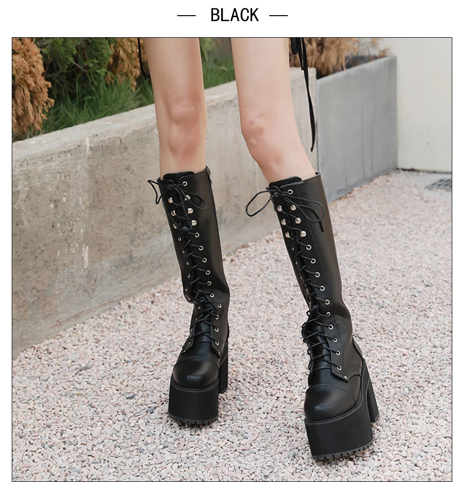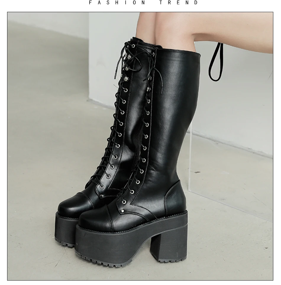 Женская обувь на толстой платформе и высоком каблуке; Большие размеры; Черные высокие сапоги в готическом стиле