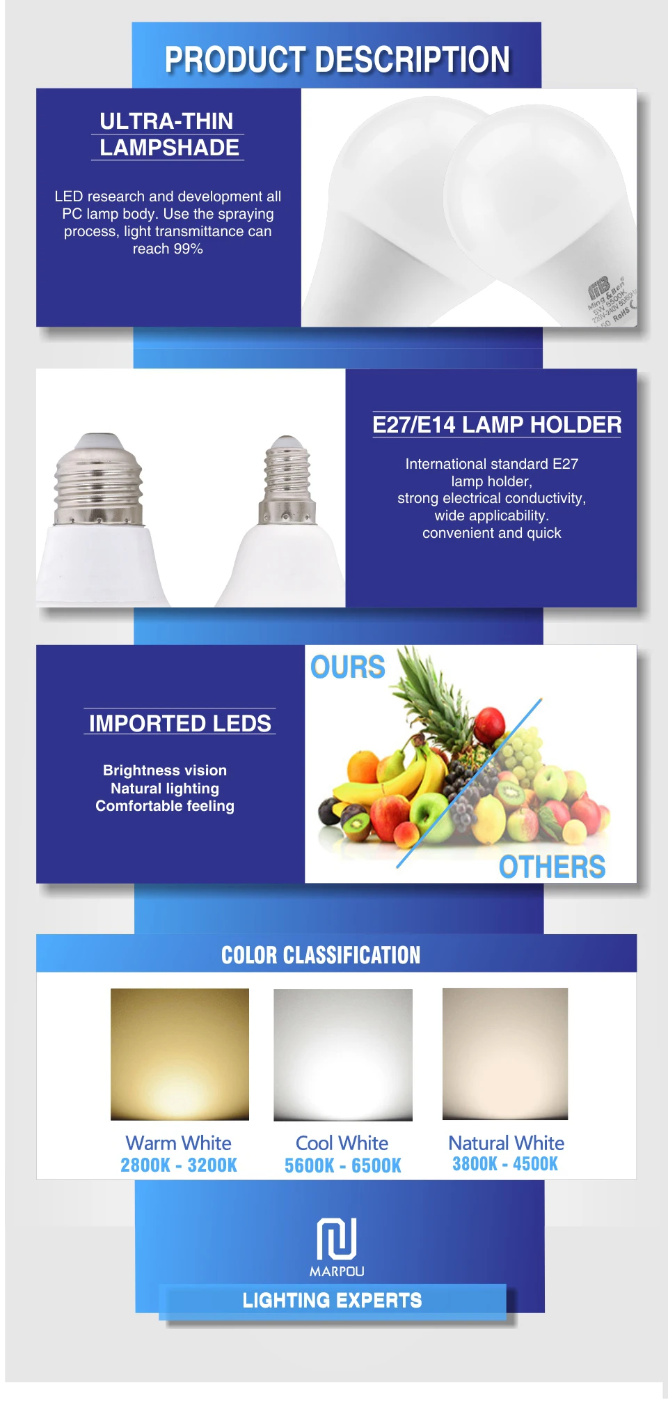 Спецификация:Наименование товара:Светодиодный светильник * 6 шт.Тип основания:E27Напряжение:220-240 В переменного токаСветодиодный Тип:SMD 2835Мощность:9 Вт/12 Вт/15 Вт/18 ВтЦветовая температура:Теплый белыйГарантия:1 годИндекс цветопередачи:Ra80Угол луча:270 градусовСрок службы:Более 10000 часов