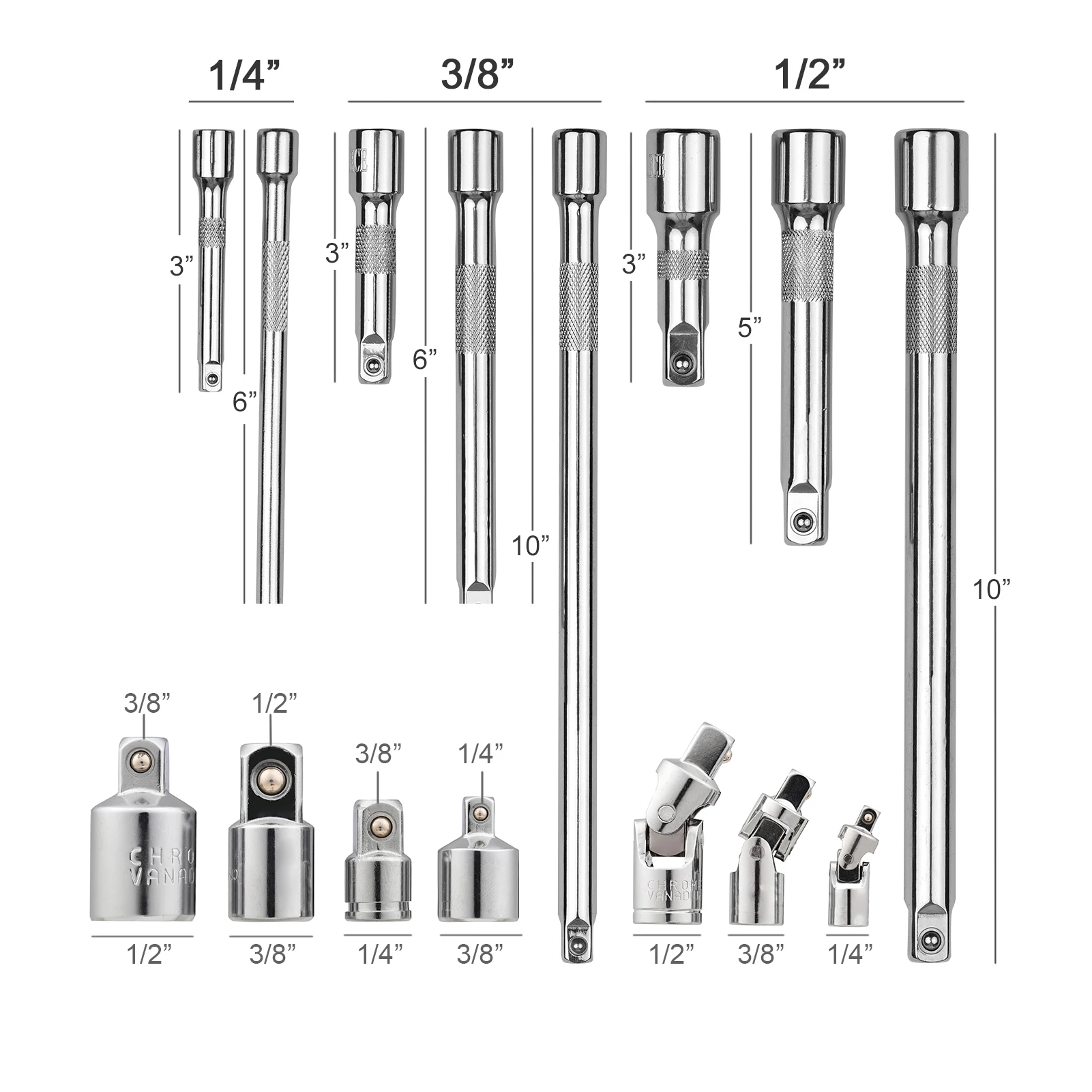 В комплект входят: 2 шт. 1/4 дюйма (3 дюйма, 6 дюймов); 3 шт. 3/8 дюйма (3 дюйма, 6 дюймов 10 дюймов); 3 шт. 1/2 дюйма (3 дюйма, 5 дюймов, 10 дюймов); 4 адаптера ударных розеток и 3 универсальных соединения.