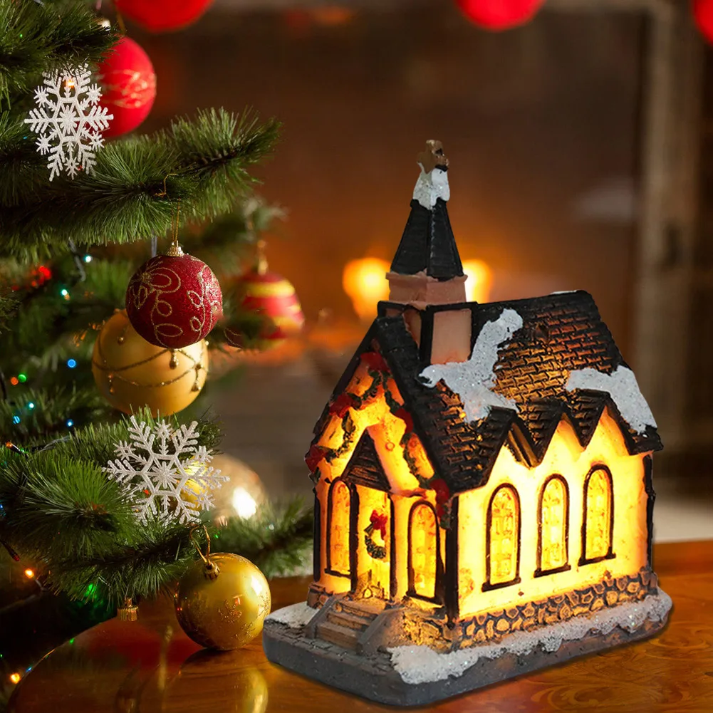 Рождественская миниатюрная скульптура из смолы в деревенском доме со светодиодным освещением, статуэтка для здания, домашние украшения, праздничные подарки для детей