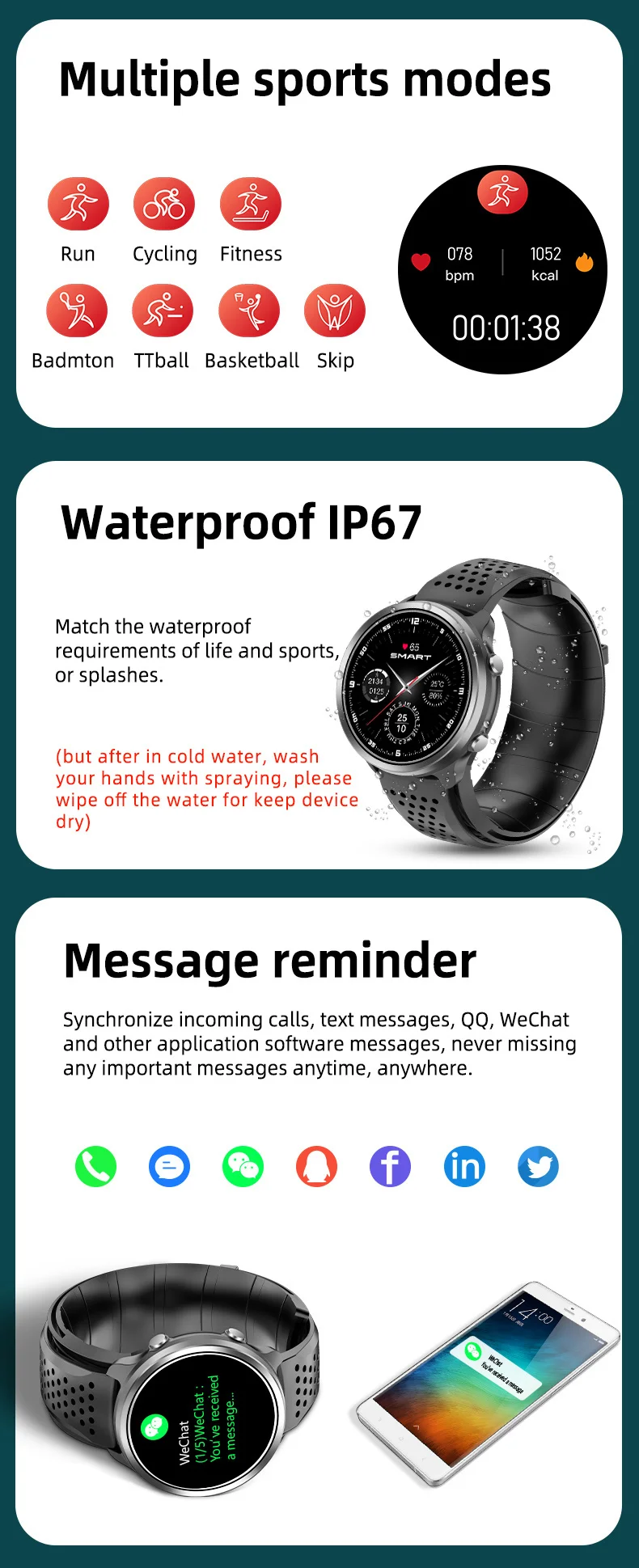 4. Поверните запястье, чтобы осветить экран, отказаться от ответа на вызов, режим нескольких видов спорта, найти браслет, шагомер для упражнений, тренировочный трек, калории, прогноз погоды, упражнения WeChat, хранение информации, IP65 Водонепроницаемый.