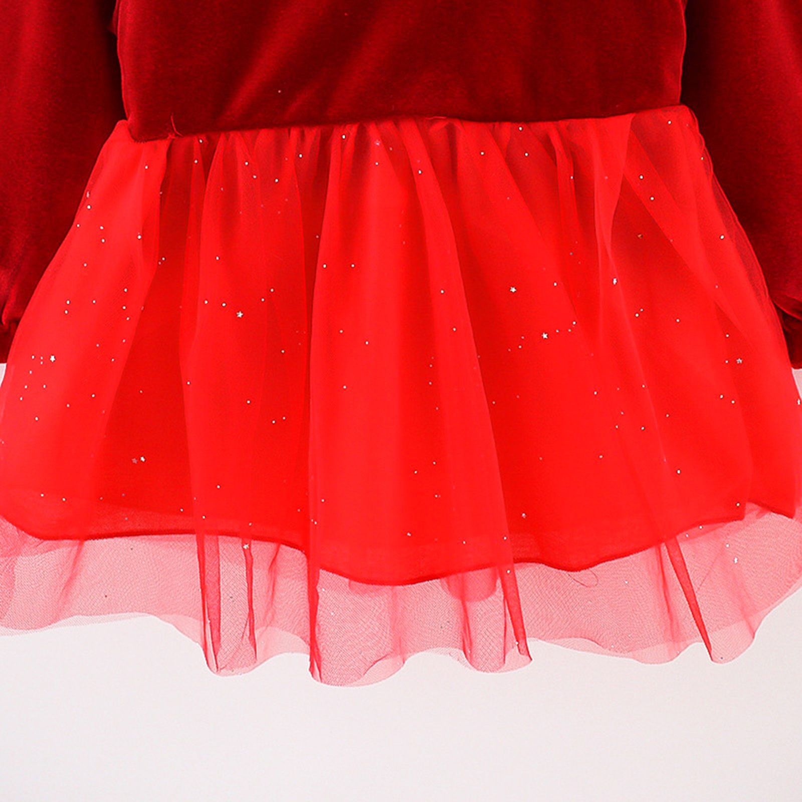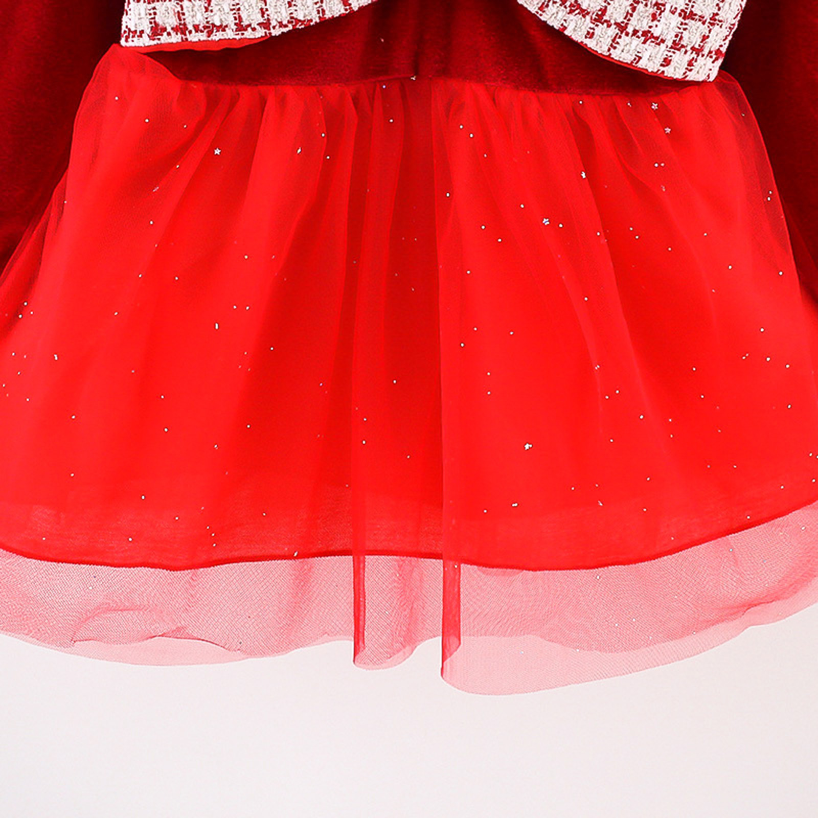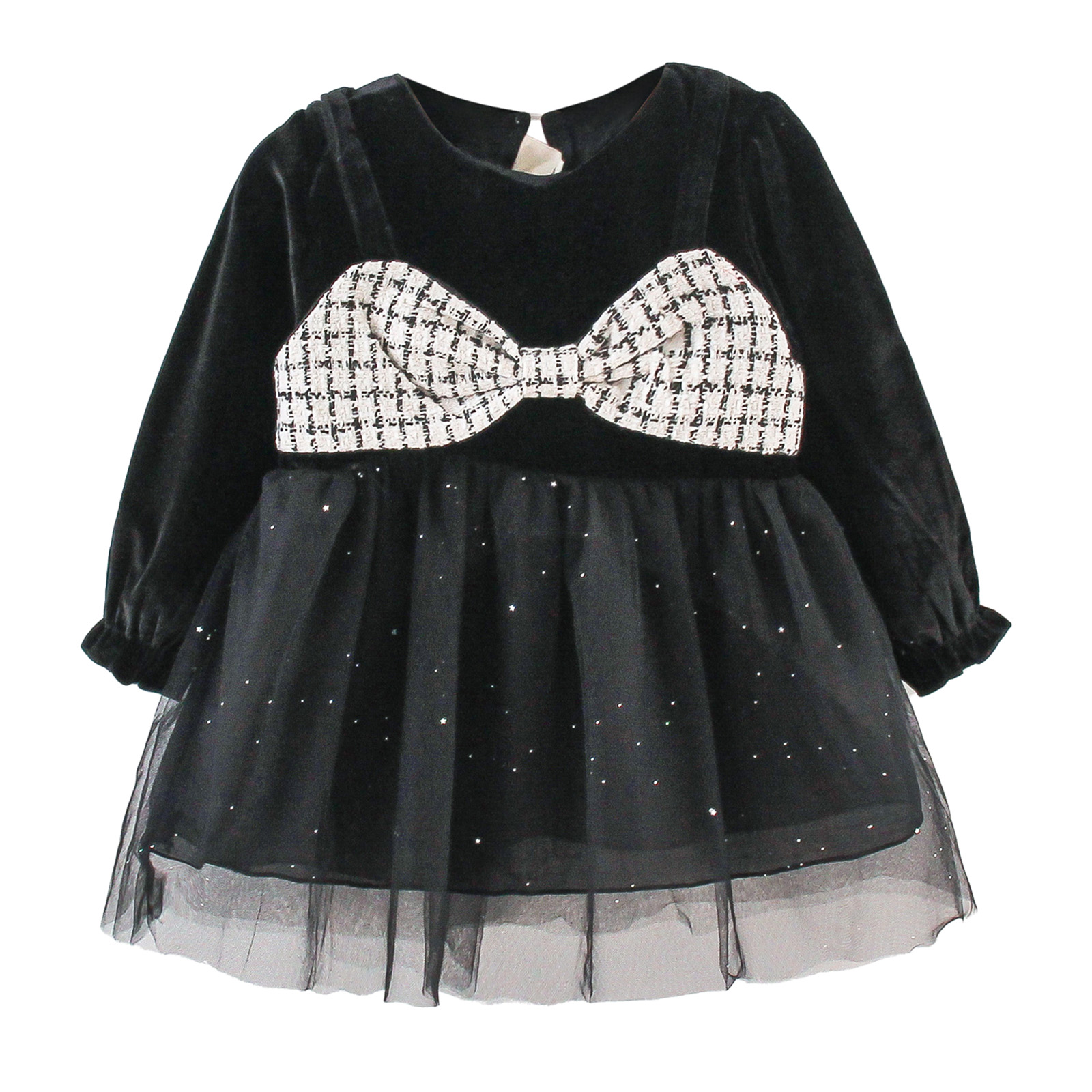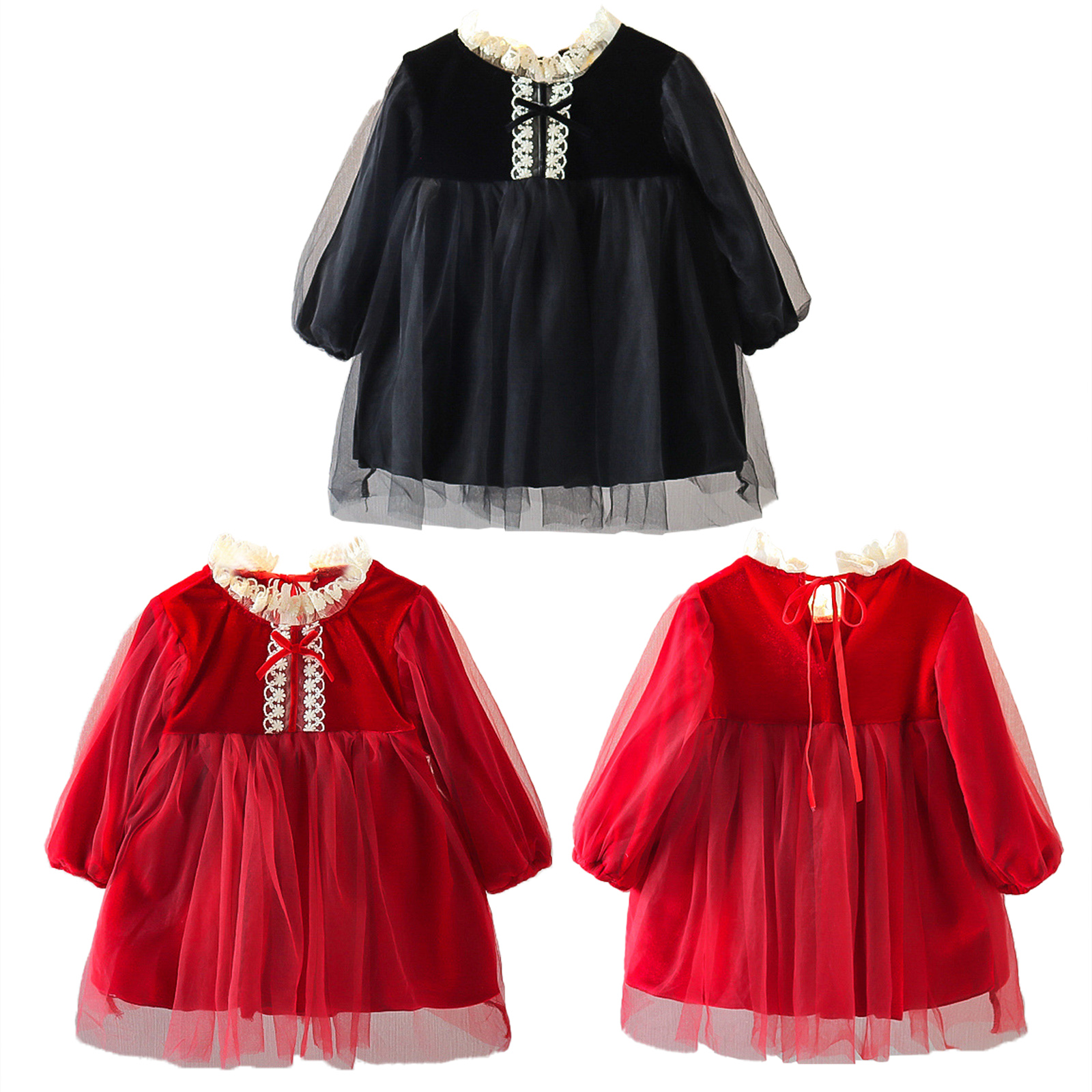 The dress features with long sleeve and ruffle neckline, lace embroidery and bowknot decorated in the front.