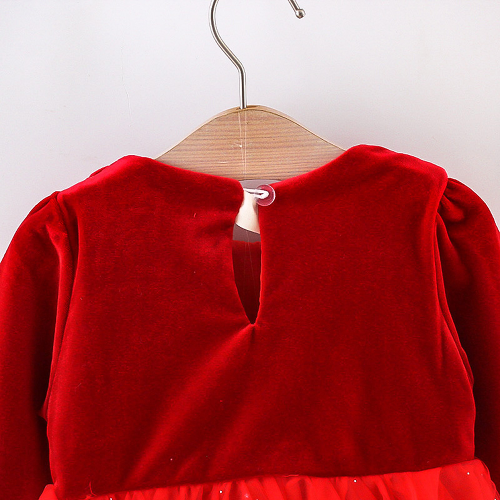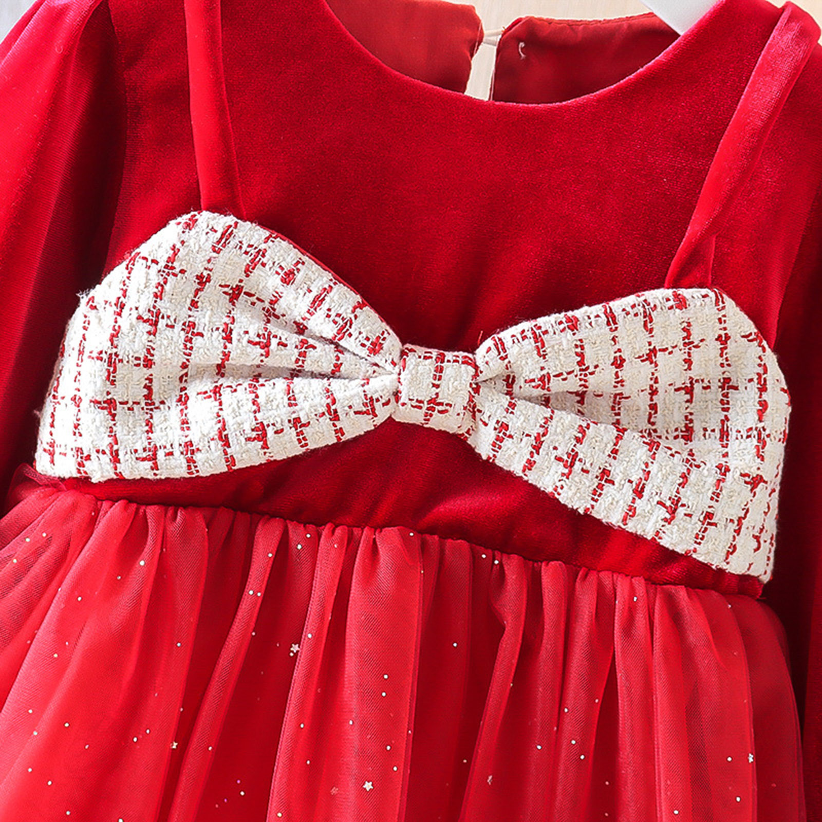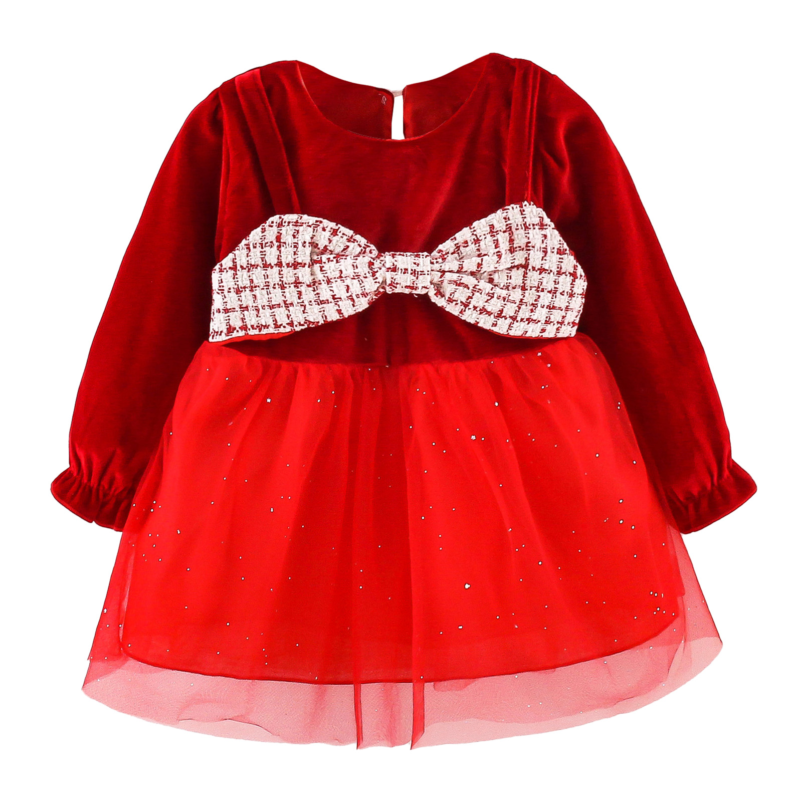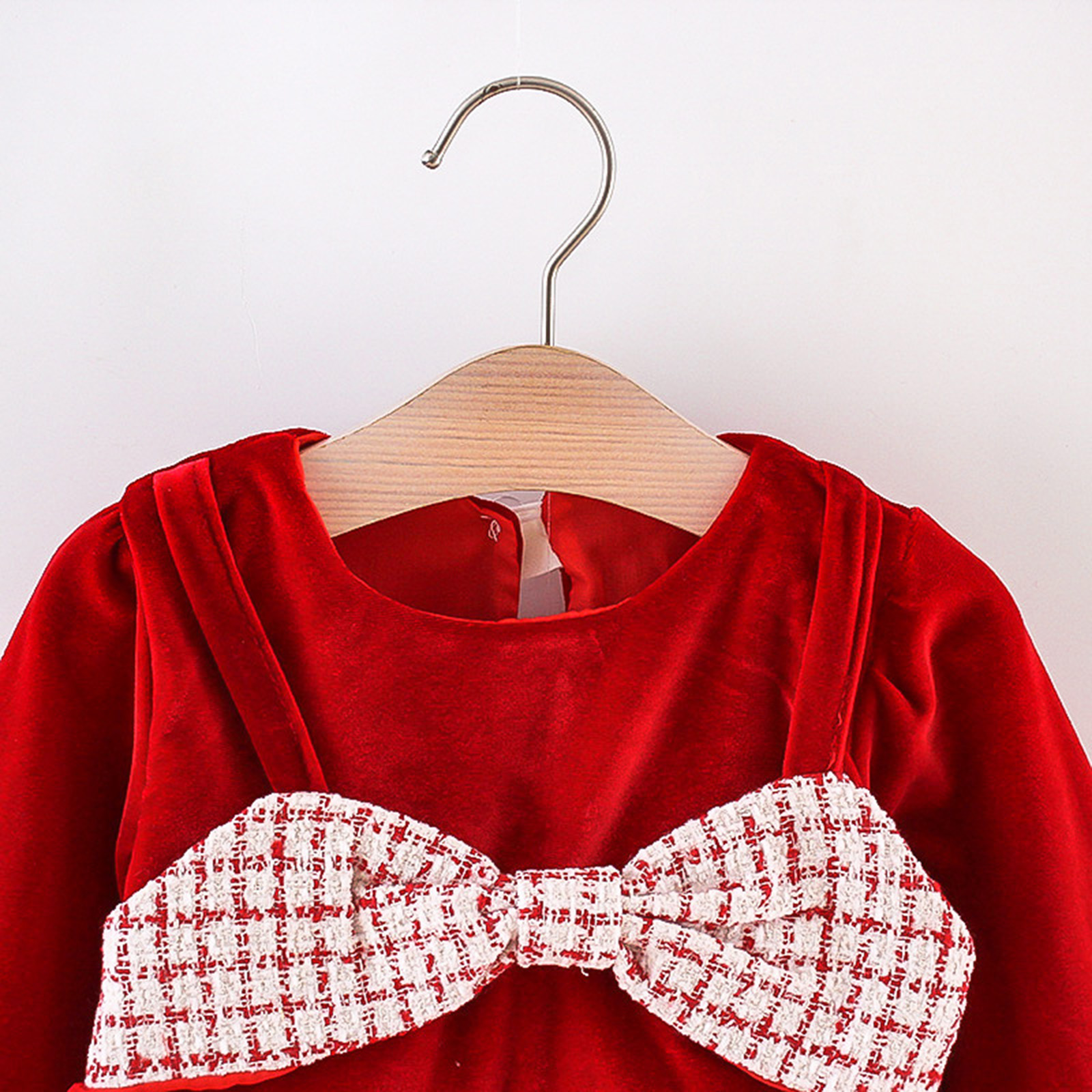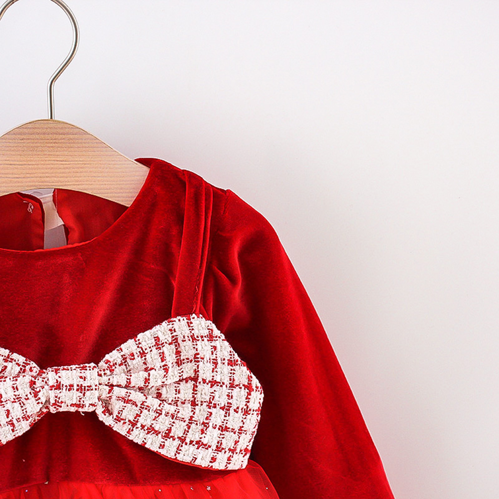The dress features with long sleeve and ruffle neckline, lace embroidery and bowknot decorated in the front.